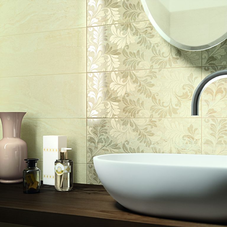 Hiukan suuremmalla satsauksella tavallinen kylpyhuone muuttuu spaksi. Kullanhohtoiset kaakelit pienessäkin osassa seinää tekevät ihmeen. Kokeile esimerkiksi lavuaarin taakse. Kuvassa ovat Värisilmän uudet Grace-sarjan kaakelit.