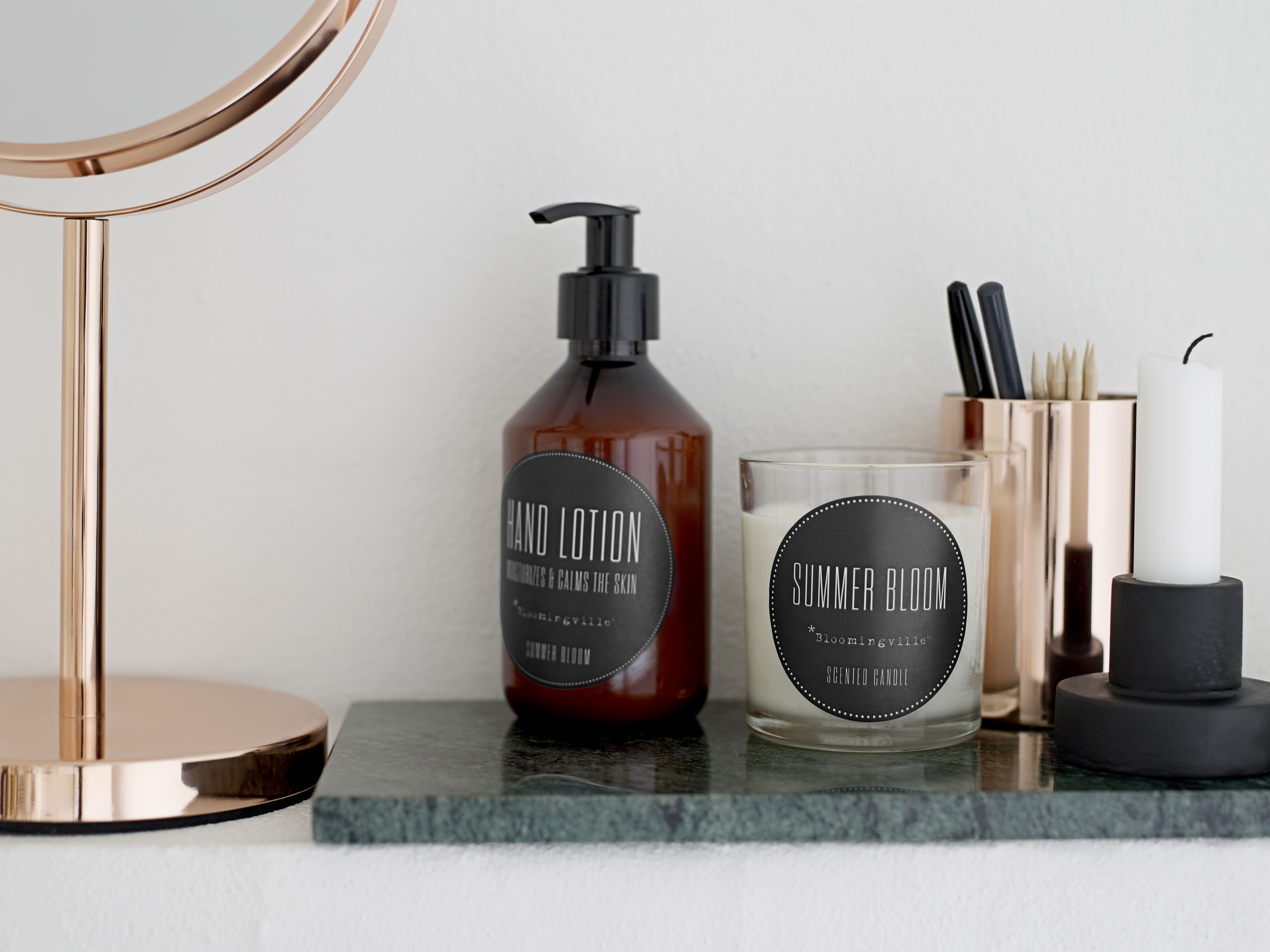 Hanki kylpyhuoneeseen kauniit saippuapullot, joihin voit alkuperäisen saippuan loputtua täyttää marketin halvempaa versiota. Myös kynttilät kylppärissä sekä (edes pieni) marmorilevy lisäävät ylellistä vaikutelmaa. Marmoriesineitä voi löytyä kirppareilta. Kuva: Bloomingville.
