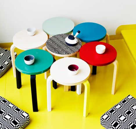 Alvar Aallon suunnittelemista E60-jakkaroista teet persoonallisen sohvapöydän näin: Etsi erivärisiä jakkaroista tai tuunaa jakkarat itse. Yhdistele erilaiset jakkarat pöydäksi. Pöytä on kätevästi muuntuva. Kun tarvitset lisää istuinpaikkoja esimerkiksi ruokapöydän ääreen, nostat jakkarat niiden alkuperäiseen tarkoitukseen! P.S. Jakkaroita myy Artek.
