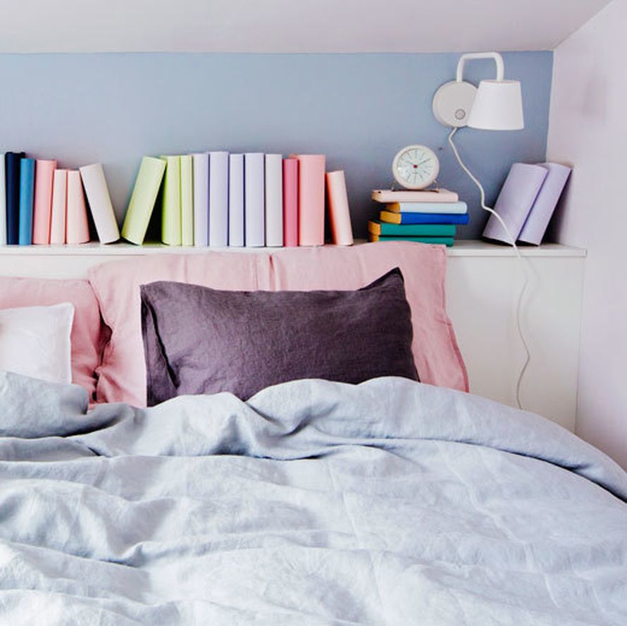 <p><p>Tässä makuuhuoneessa taas kirjat ovat piilossa kartonkien alla. Pastellisävyisillä kartongeilla päällystetyt kirjat ovat kuin harmoninen maalaus makuuhuoneen yöpöytätasolla. Ja voi niitä edelleen lukea, kunhan vain muistaa, millä värillä minkäkin kirjan on päällystänyt...</p></p>