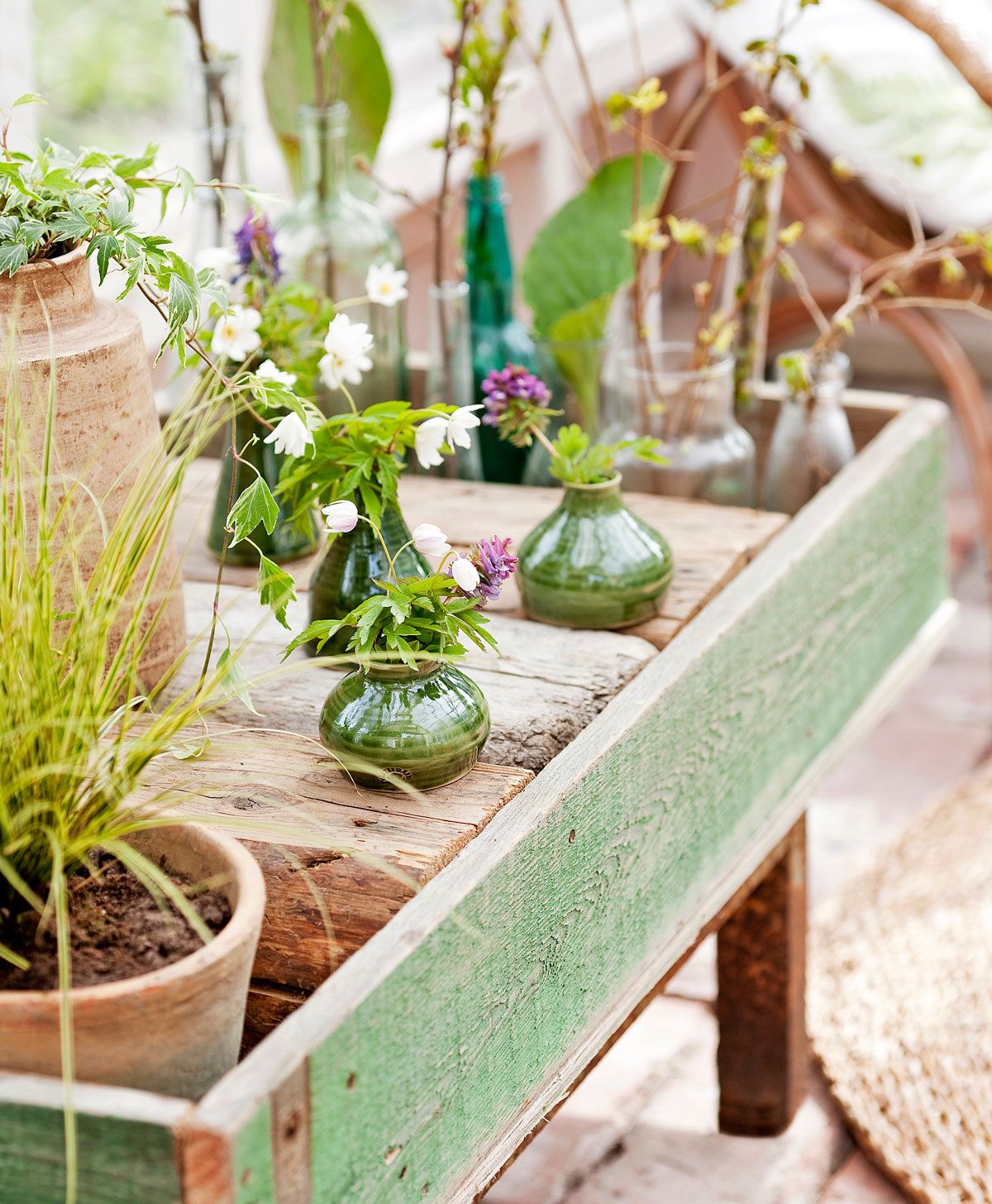 Vihreät kasvit ja lasi, luonnonmateriaalit ja suloiset kasviaiheiset tekstiilit päästävät puutarhurin luovuuden valloilleen.