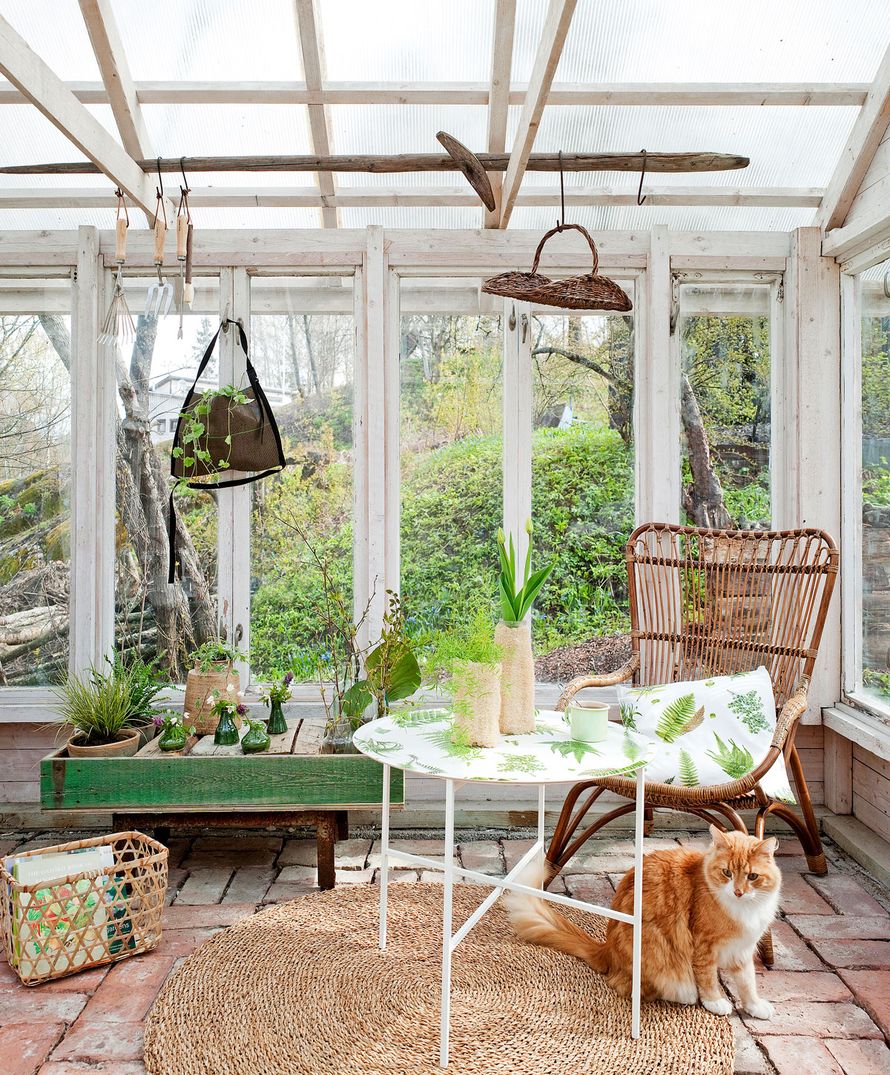 Rento tunnelma viherhuoneeseen syntyi kekseliäistä ideoista ja luonnollisista materiaaleista. Monet-rottinkituoli 339 e, ja roikkuva Bacsac-ruukku 35 e, Sisustaulkona.fi. Vesiruohomatto 120 e, Peroba. Hjerten & Hjertenin kasviaiheiset tarjotinpöytä 123 e ja tyyny 52 e, Gumböstrand. Lehtikori 16 e, Peroba. Roikkumassa olevat työvälineet ja kukkien keräilykori, Hyöty-kasviyhdistys. Tajotinpöydällä on kaksi luonnonsienestä tehtyä maljakkoa, jotka syntyivät työntämällä lasit sienten sisälle.