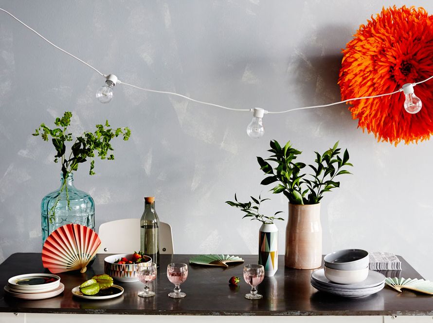 Kuvan tuotteet: Sulkakoriste, halkaisija 50 cm 490 e, Vinkel Shop. Valonauha 59,90 e/10 m, Granit.Hayn -viuhkat 7 e kpl, Viale. Vasemmalla Sääpäiväkirja -lautaset 27 e/ kpl, Marimekko. Niiden alla Menun nuden väriset lautaset 27,60 e kpl sekä harmaa ja valkoinen kulho 27,60 e kpl, Viale. Tine K:n valkoiset lautaset 22 e/ kpl, viinilasit 9 e/kpl, roosa vaasi 74 e, lasikarahvi 59 e ja servietit 12 e, Nougat. Ferm Livingin kuviollinen Spear -vaasi 52 e ja kulho 62 e, Pore helsinki. Kasvit Kukkakauppa Rose-Marie. Metallinen pöytä 90 x 185 cm, Vinkel Shop.
