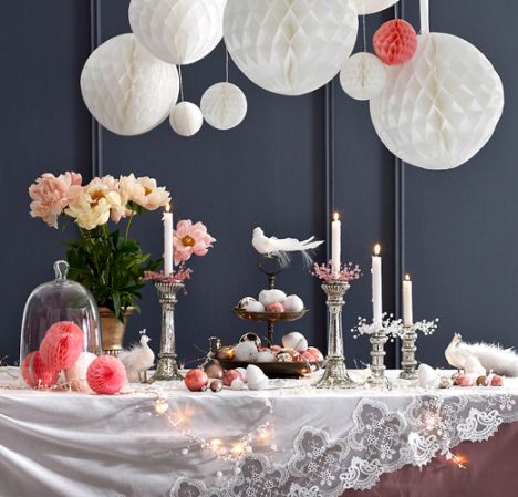 Pitsiliinat, paperipallot ja erilaiset koristeet kaikissa vaaleanpunaisen sävyissä eivät ehkä muistuta ensimmäisenä pääsiäisestä, mutta eivätkö ne sovikkin teemaan sulkineen kaikkineen aivan loistavasti? Kynttilät ja valosarjat viimeistelevät tämän romanttisen pääsiäistyylin, joka luo täydellisen tunnelman pitkään herkuttelevaan illanviettoon. Kuvan tuotteet: Ellos.