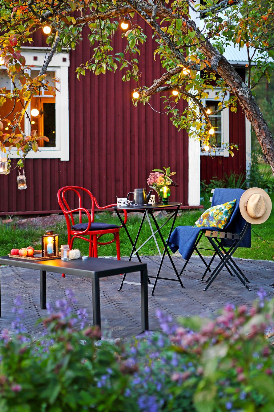 Lepopaikka kutsuu nauttimaan syysilloista. Fermobin Bistro-puutarhapöytä 124 e ja tuolit 71 e/kpl, Finnishdesignshop.fi. Källemon penkki 1 390 e, Design Projects Helena Orava. Arabian Paratiisi-teekupit 23,50 e/kpl. Ulkovalosarja 29,95 e, Clas Ohlson.