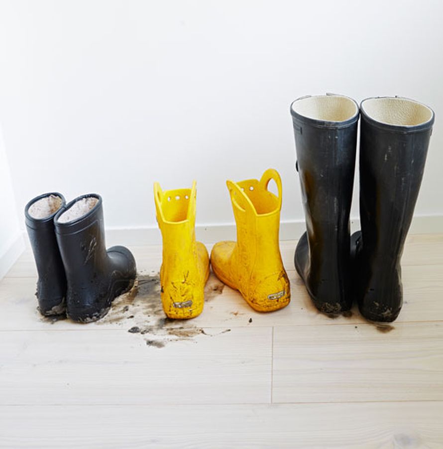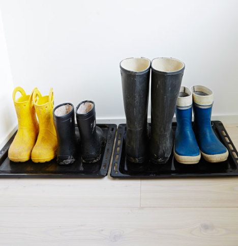 Puhdista vanhat uunipellit liasta ja rasvasta ja laita ne eteisen lattialle. Kura kertyy kumisaappaista pelleille, jotka on helppo huuhtaista silloin tällöin puhtaaksi. Näin lattialle ei jää kurajälkiä ja se myös pysyy paremmassa kunnossa.