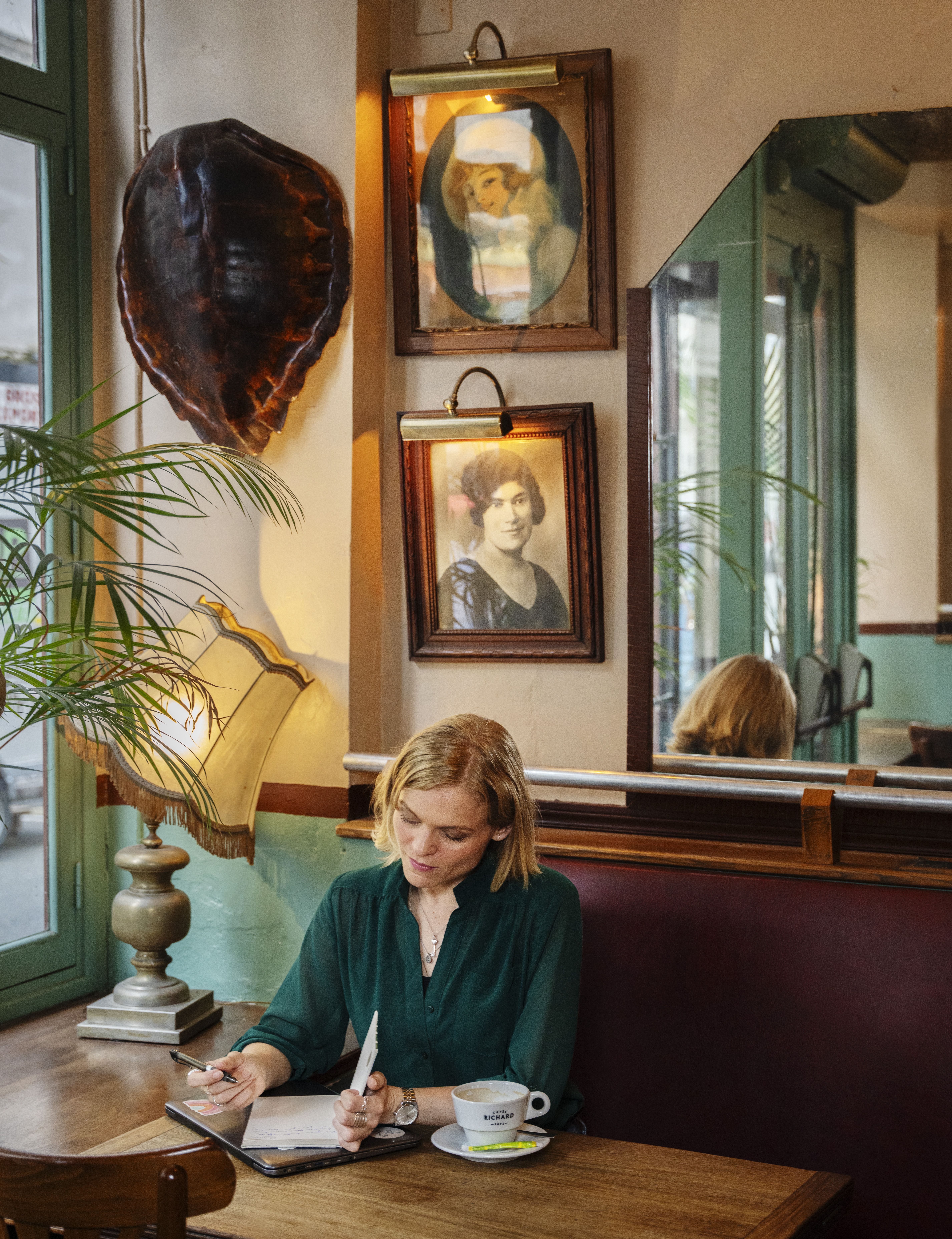 -Kirjoitan Little Kitchen -lähikahvilassa, pittoreskissa Café de l'Industriessä tai Starbucksissa, joka on kaukana Pariisin glamourista. Monet tekevät niissä töitä yksin, kuin etätöitä rinnakkain, mikä luo yhteistä energiaa. Se muistuttaa, etten ole yksin ja kannustaa jatkamaan.