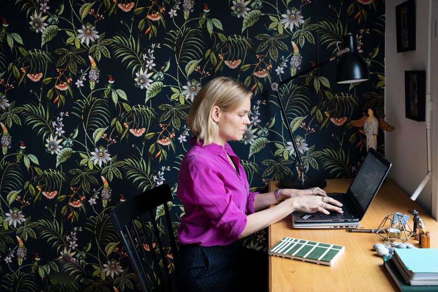 Kukkakuvioinen tapetti värittää kodin työhuoneen seinää. Sitä vastapäätä hyllyt notkuvat kirjoista. Välissä on työpöytä, jolla lepää tietokone ja muistiinpanovälineet. Ikkunasta näkyy taivas. Muuta ei tarvita.