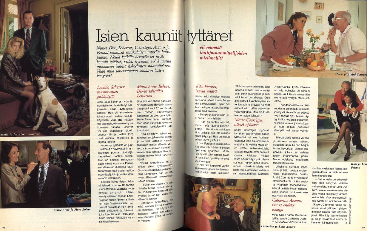 Nämäkö huippusuunnittelijoiden mielimallit, vihjasi jutun alaotsikko nykyisen nettiotsikon tyyliin. Marraskuun 1987 Gloriassa lukijalle esiteltiin ranskalaiset tytär-isäkaksikot Laetitia ja Jean-Louis Scherrer, Marie-Anne ja Marc Bohan, Marie ja André Courregés, Kiki ja Louis Feraud sekä Catherine ja Louis Azzaro. Isät olivat tunnustettuja huippusuunnittelijoita, aikuiset tyttäret taas... no, pärjäsivät vaihtelevasti.