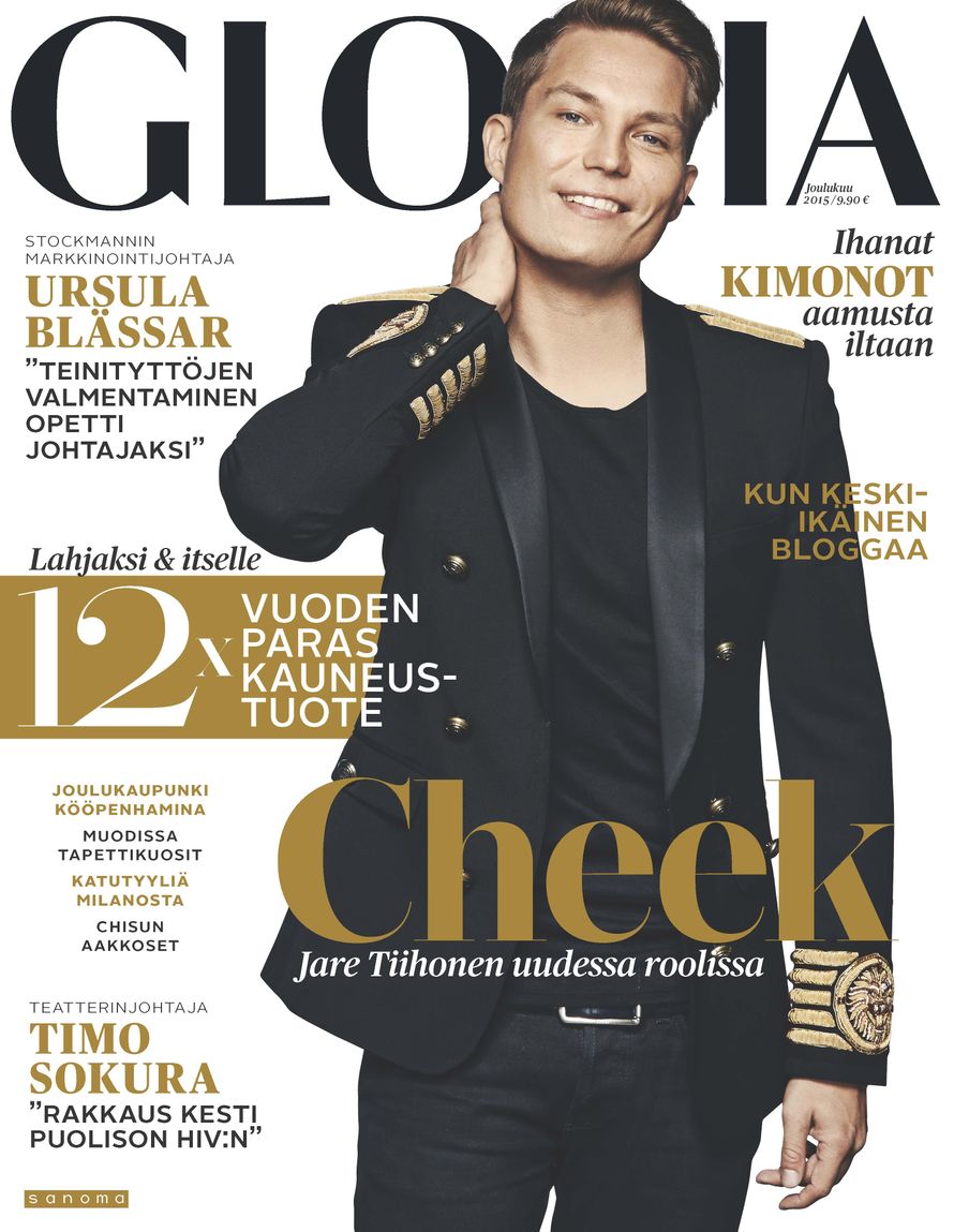 Marraskuun 25. päivänä ilmestyvässä Glorian joulunumerossa kannen valtaa ensimmäistä kertaa yksin mies. Kyseessä on suomalaisen popmusiikin supertähti Cheek eli Jare Henrik Tiihonen. Essi Myllyojan tekemän haastattelun Hollywood-glamouria tihkuvissa kuvissa Cheek esittelee juhlakauden muotia yhdessä ukrainalaisen mallin Alinan kanssa. Kuvat on ottanut Jonas Lundqvist ja stailannut Anna Komonen.