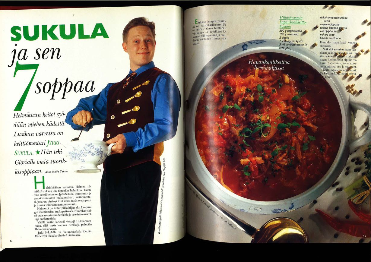 Vuonna 1995 Jyrki Sukula esitteli Glorialle suosikkikeittonsa, joiden joukosta löytyy sopiva soppa niin hienoille illalliskutsuille kuin hiihtoladullekin.