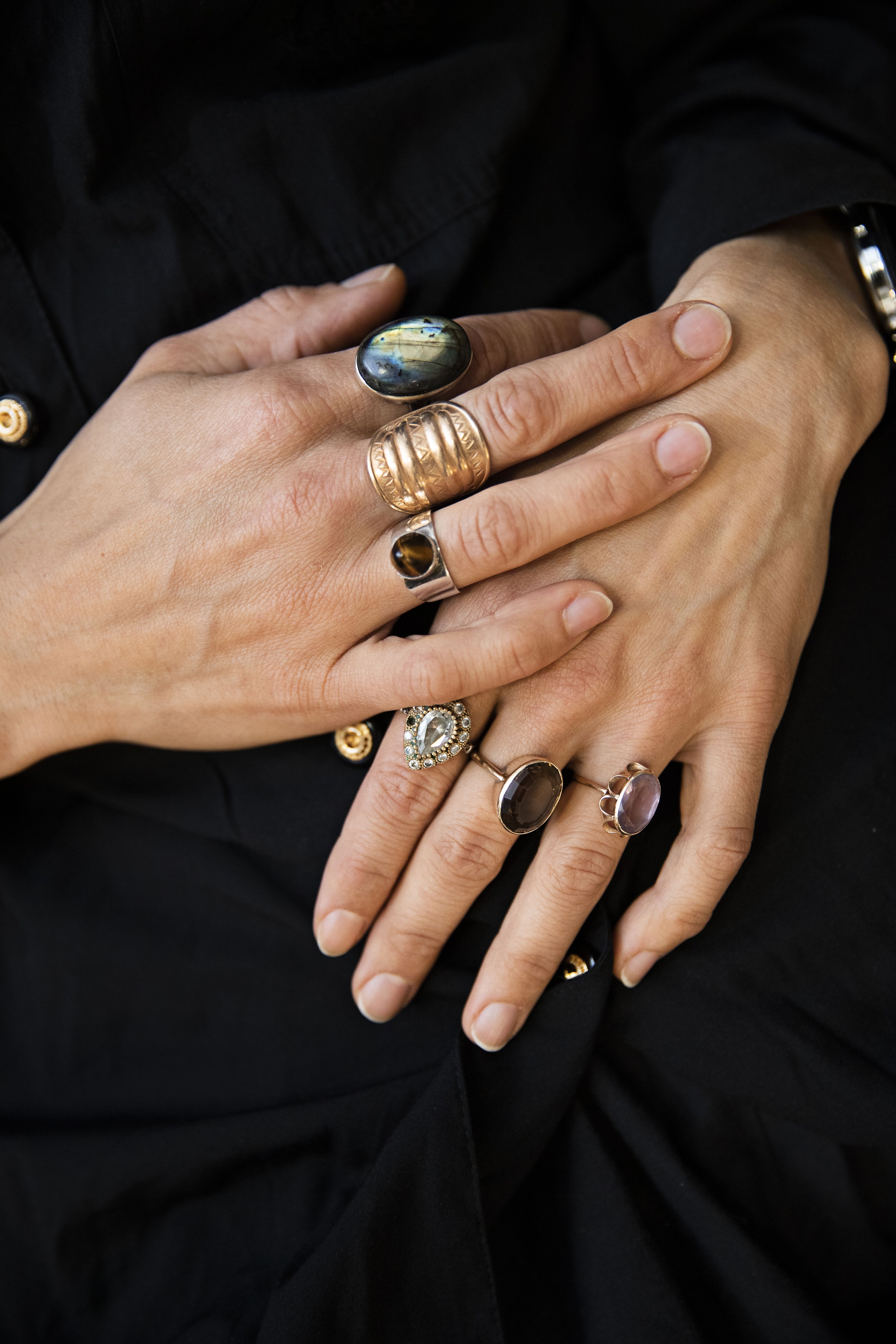 Sormukset, jotka muistuttavat minulle tärkeistä ihmisistä. Ne sitovat minut samaan aikaan johonkin jatkumoon, fyysisiin sukulaisiini ja vereen. Ne ovat myös hemmetin kauniita. Jos pitäisin vain yhtä kerrallaan, tuntuu, että arvottaisin silloin ihmisiä. Ja se näyttäisi tyylillisesti liian söpöltä. Nuorempana en sietänyt käsiäni, koska ne olivat mielestäni liian isot, miehekkäät ja suonikkaat. Nyt haluan korostaa niitä sormuksilla.