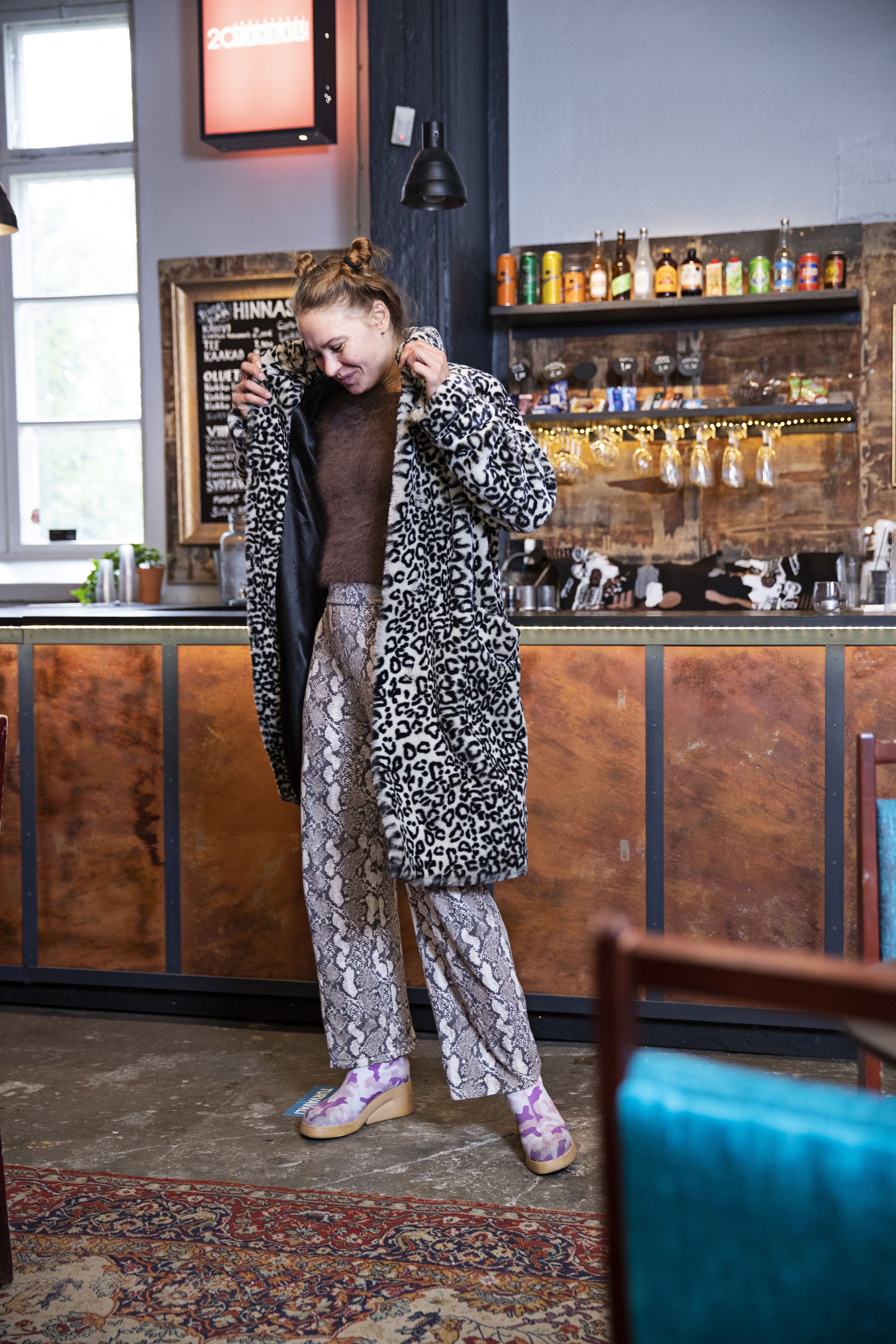 Tyylissäni ovat mukana mukavuus ja riemu, mutta toisaalta pukeudun tarveperusteisesti. Joskus tarvitsen halausta tai haluan olla piilossa, jolloin en pue mitään huomiota herättävää. Jos haluan mielen kohotusta, valitsen olkatoppaukset tai laitan päähäni karvalakin kuin kruunuksi.