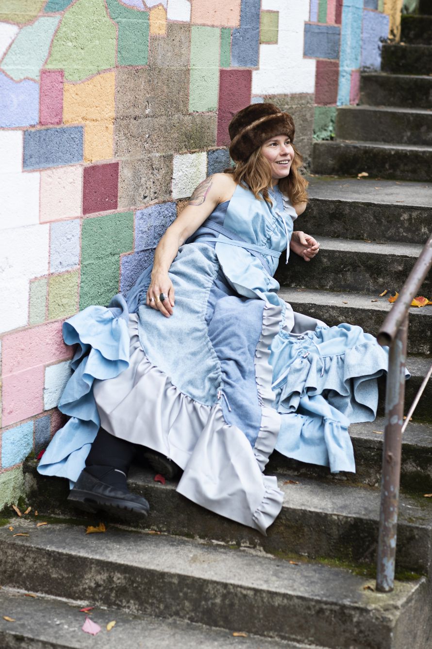 Turussa hän saattaa pyöräillä vanhat roller derby -polvisuojat sukkahousujensa päällä.
