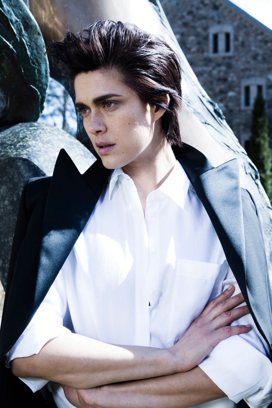 Näyttelijä Krista Kososen pitkä, harteikas hahmo ja veistokselliset juhlavaatteet sulautuvat yhteen kuvanveistäjä Laila Pullisen massiivisten graniitti- ja pronssiteosten kanssa. Vaatteiden lisäksi särmää Kristan olemukseen tuo rouhea hiustyyli. Kristan pitkät hiukset saivat lähteä viime kesänä Kätilö-elokuvan kuvauksissa.