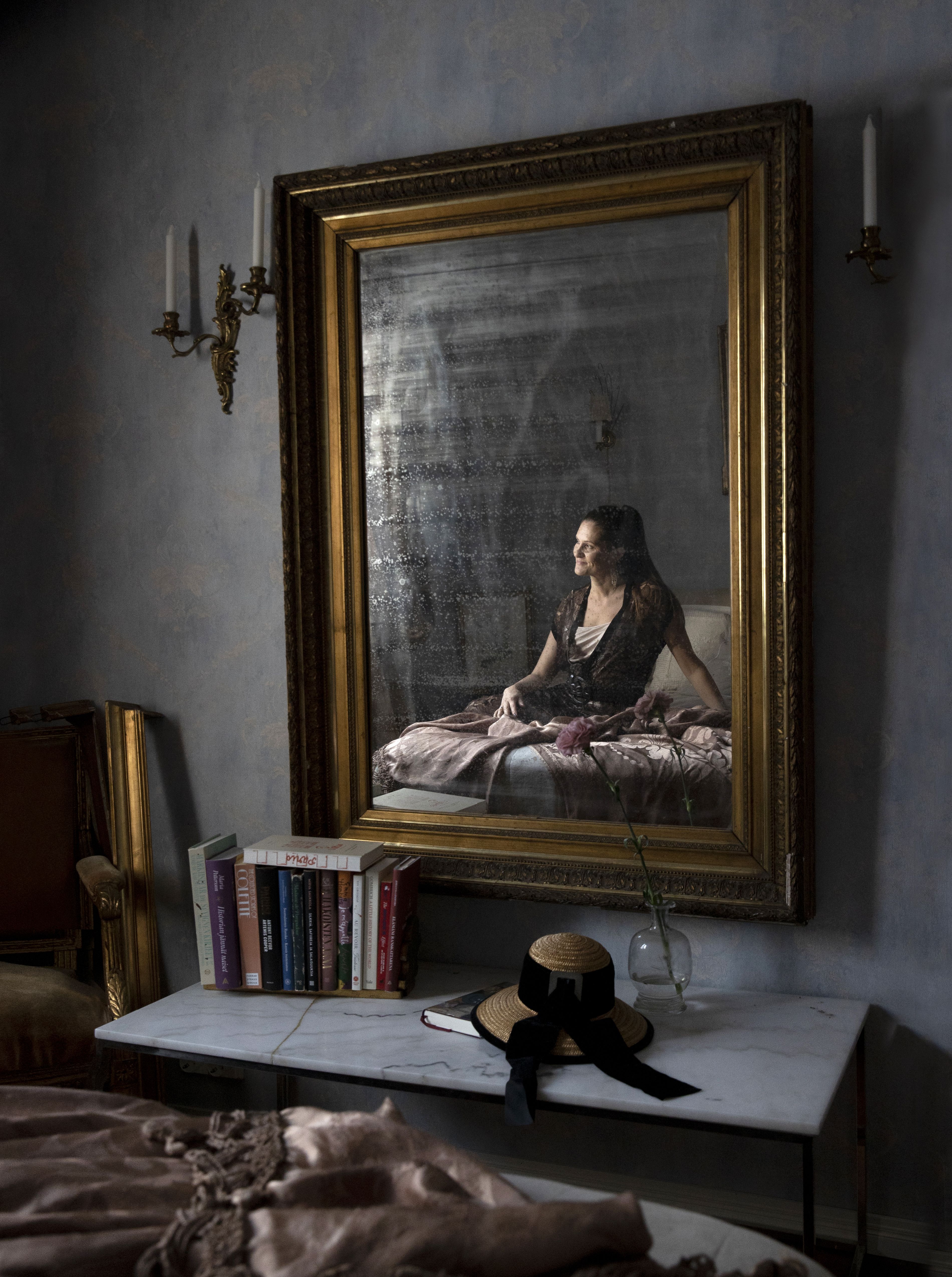 Yläkerrassa on buduaari, joka pursuaa kiehtovia kalusteita ja esineitä. Kukkakankaalla verhoillun "pullukkatuoliryhmän" lisäksi katseen vangitsevat muun muassa kampauspöytä, matka-arkku ja näyttävä peili, jota kehystävät merenneitofiguurit. Kaikki on vanhaa ja tuotu Ranskasta.