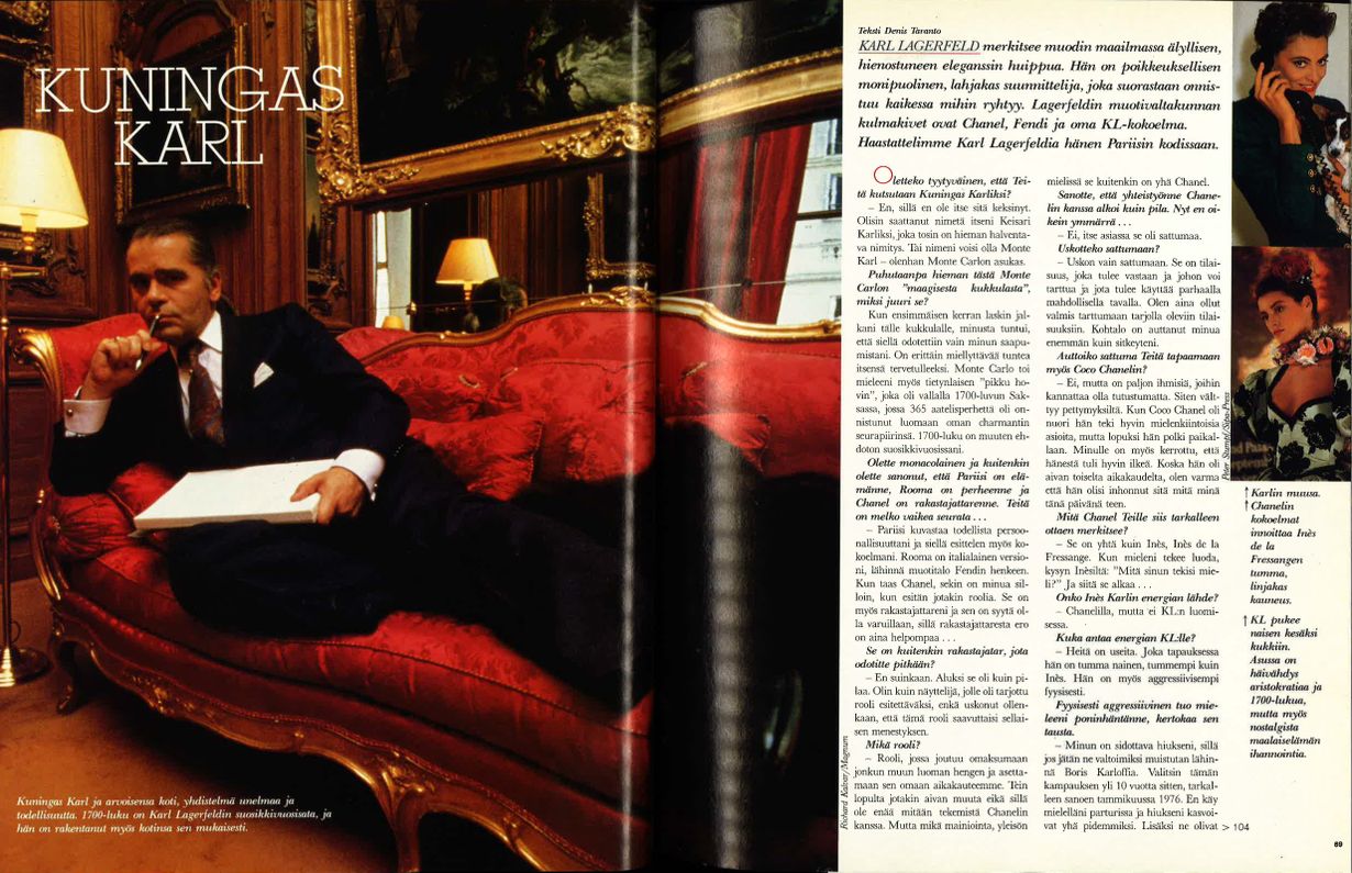 Haastattelussa 55-vuotias Karl kertoo kampauksen olleen hänen tavaramerkkinsä vuodesta 1976, jolloin hän hermostui pitkiin ja luonnonkihariin hiuksiinsa. Ilman poninhäntää suunnittelija sanoo muistuttavansa Frankensteinin hirviötä esittänyttä näyttelijää Boris Karloffia. Ja vaikkei sitä jutun kuvista näekään, olivat myös silmälasit osa miehen tyyliä jo 80-luvulla.
