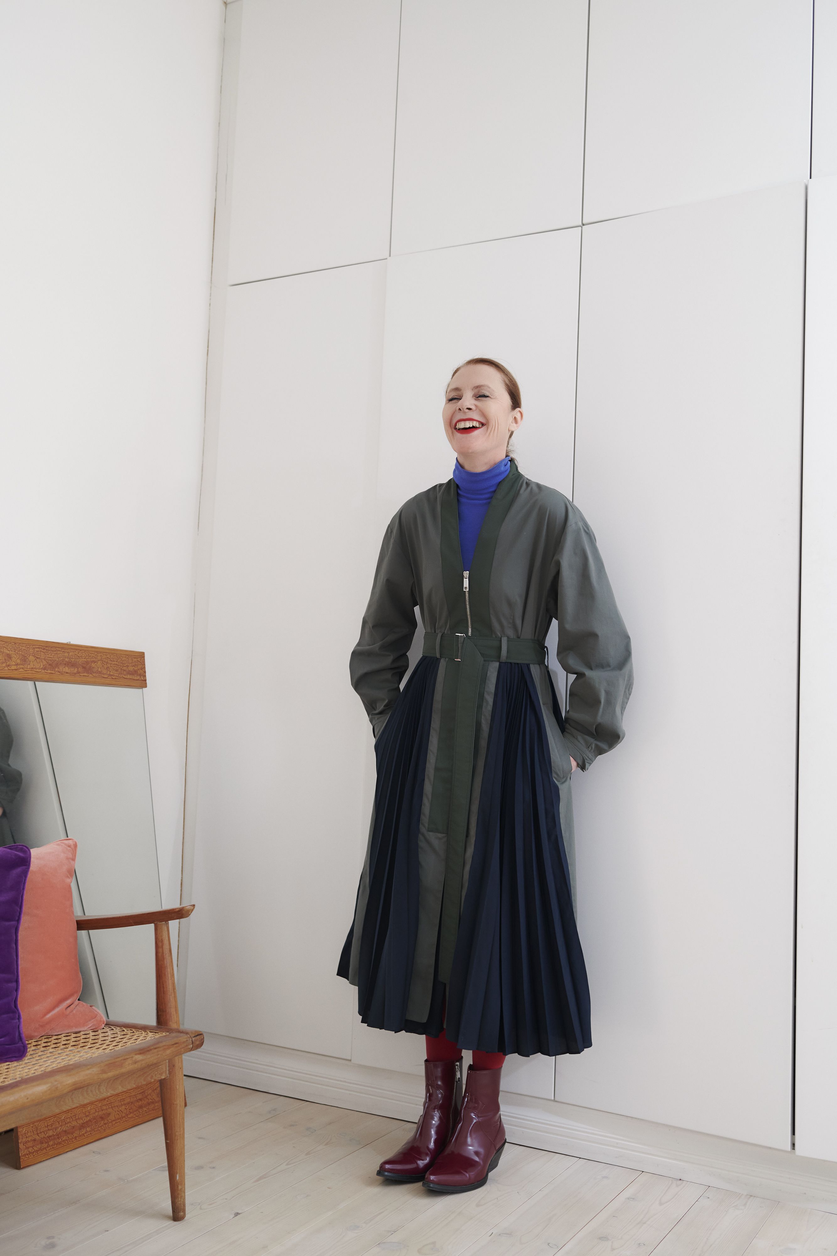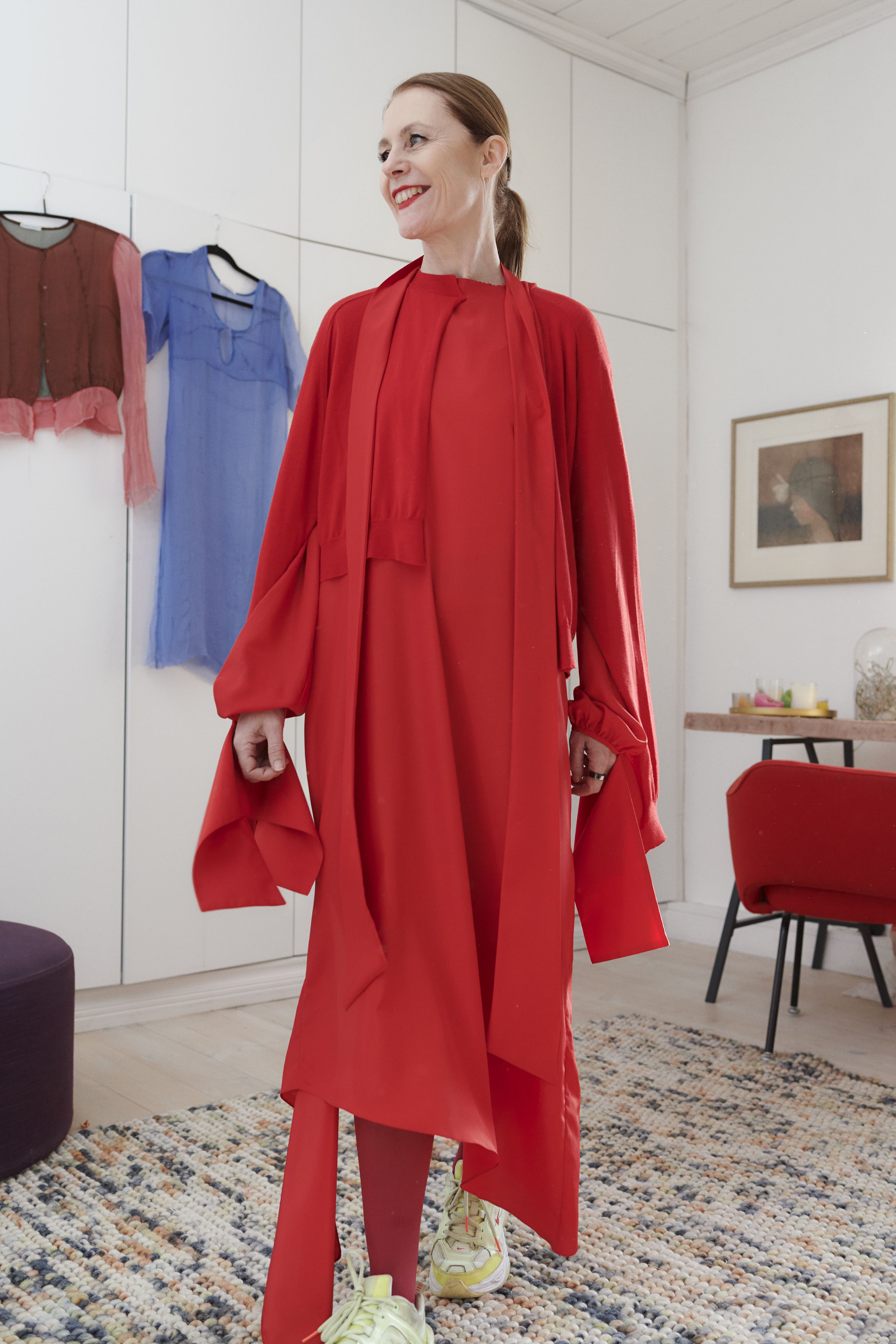 Usein suositellaan rakentamaan kapselivaatekaappi, joka rakentuu valkoisista paitapuseroista ja mustista housupuvuista. Entä, jos ei tykkää valkoisista paitapuseroista? En omista yhtään sellaista. En tykkää myöskään bleisereistä. Haluan, että minulla on oma tyylini, josta saan iloa. Tavaramerkkini on värikkyys. Käytän paljon mekkoja ja tykkään pukea niiden kaveriksi erivärisiä sukkahousuja ja neuleita.