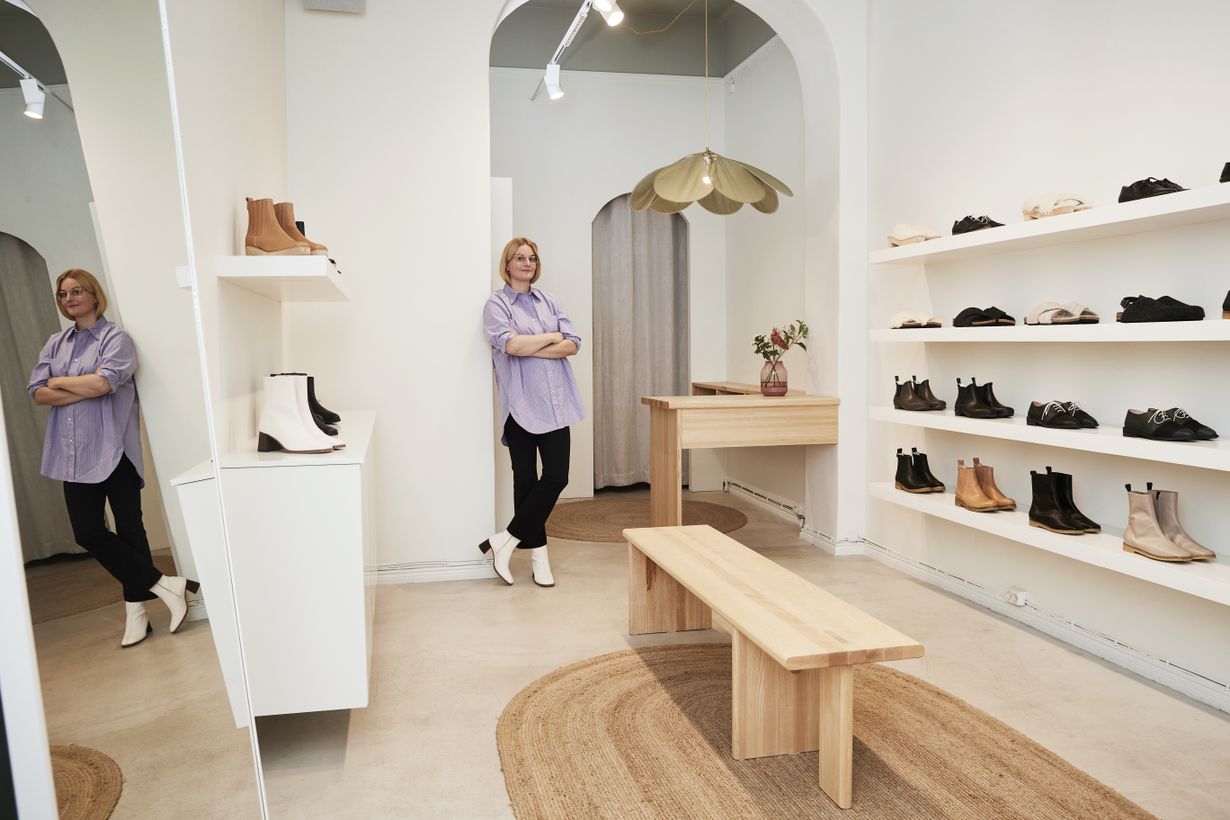 Kun astun aamulla sisään myymälääni, saan rauhan, sanoo kenkäsuunnittelija Terhi Pölkki. Omassa kivijalkaliikkeessä ei ole samanlaista hälinää kuin edellisessä tilassa kauppakeskuksessa.