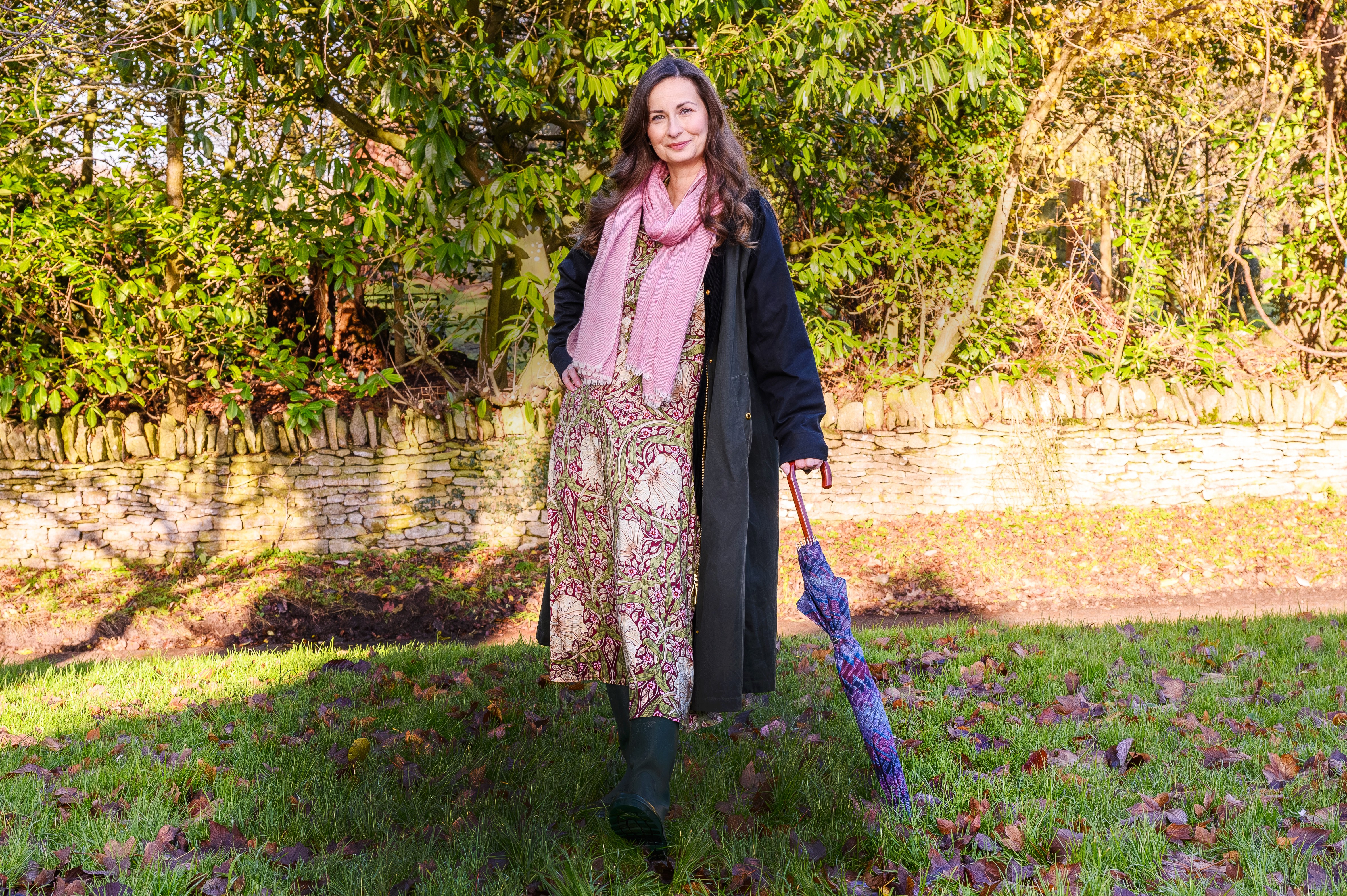 Itse Catharina viihtyy arkena kumisaappaissa. Kumisaappaita ja öljykangastakkia tarvitaankin Catharinan kotikylässä Englannin maaseudulla Cotswoldsissa.