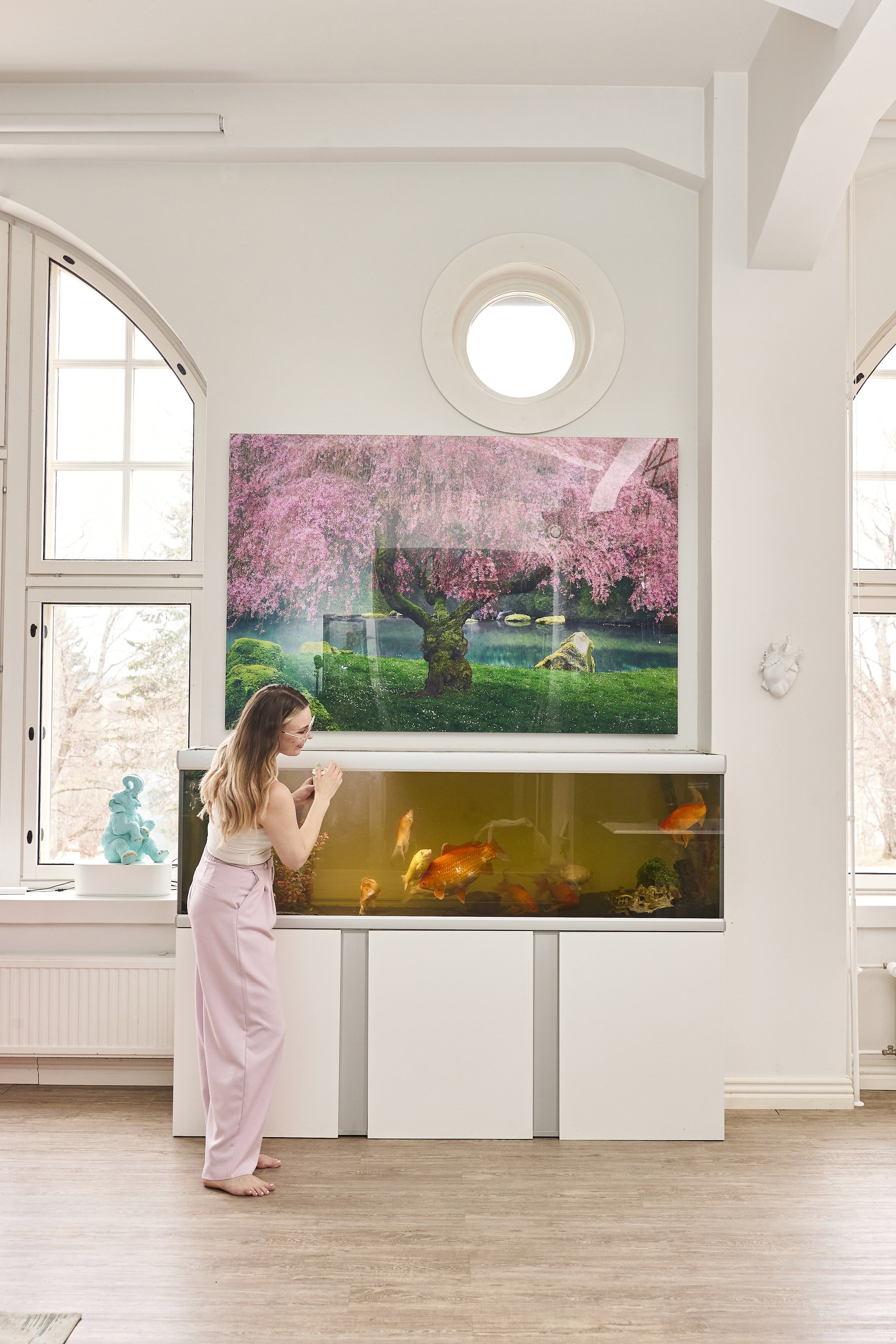 Ruokapöydän viereen on ripustettu seinän mitalta taidevalokuvia. Useimmissa poseeraa Tuire tai Iines. Kuvat ovat Jeffin ottamia.