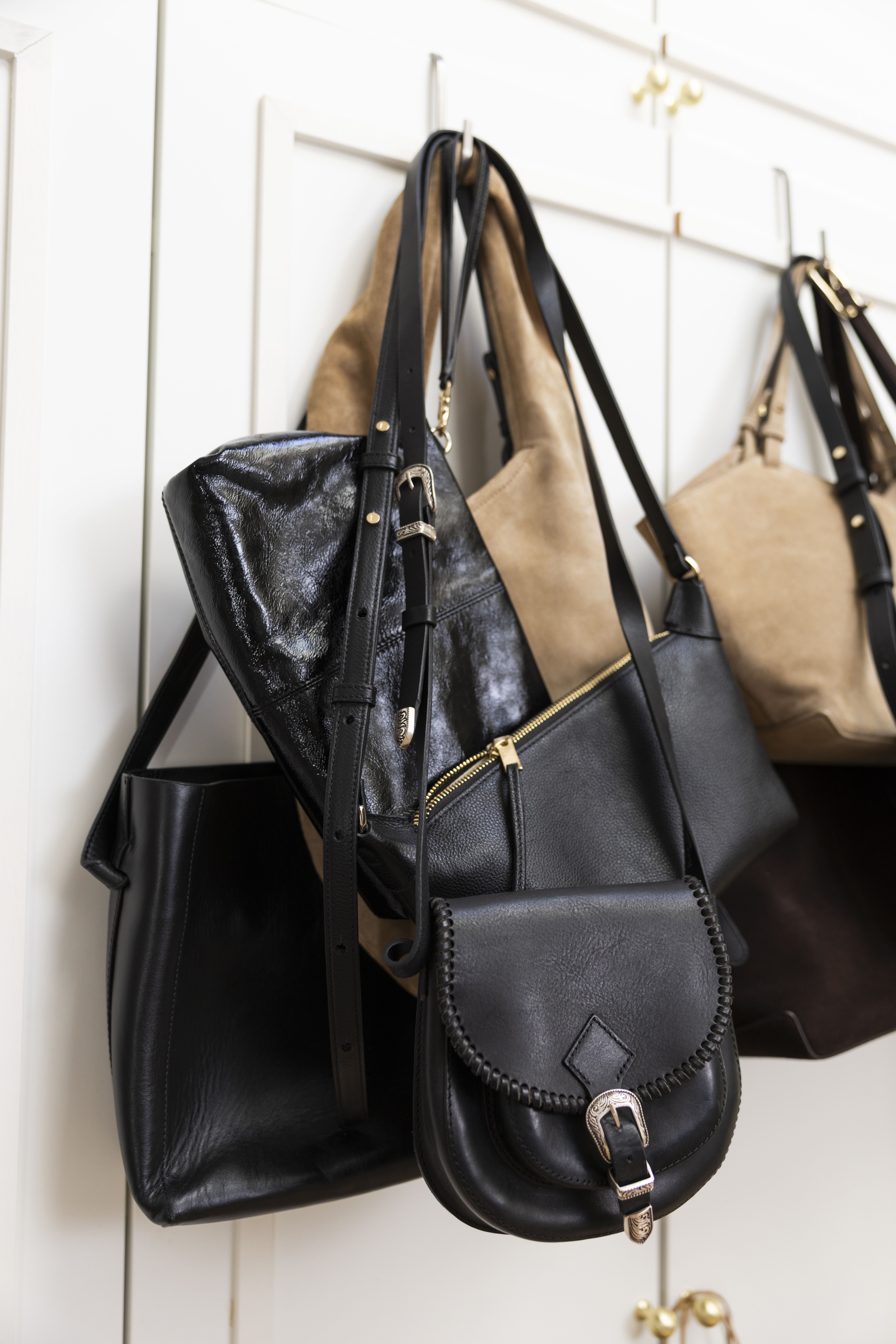 Viikkaan neuleet kaappiin enkä pidä koskaan henkarissa. Tuuletan ne ja siistin villakammalla tai nukanpoistajalla. Kotimme on pieni, joten säilytämme kausivaatteet varastossa. Se tekee myös pukeutumisesta helpompaa. Nahalle käytän puhdistusliinaa ja suojatuotteita, mokkanahkaa harjaan.