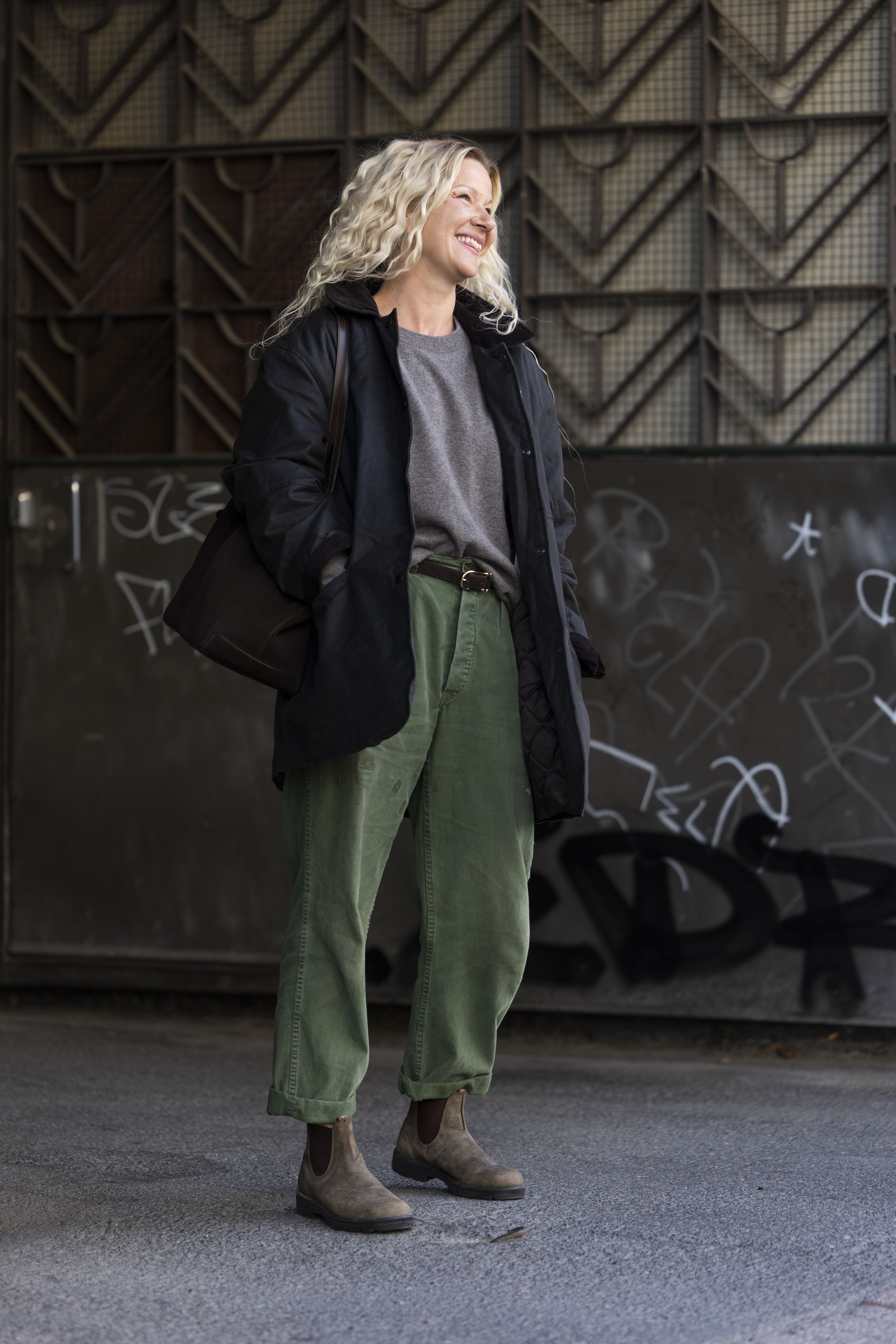 Käytän paljon rannekoruja ja sormuksia. Korvissa minulla on joko suuret näyttävät korvakorut tai ei mitään. Tykkään maanläheisistä sävyistä: valkoisesta, hiekasta, meleeratusta harmaasta, vaaleasta farkusta ja armeijanvihreästä. Piristän asua kirkkaanpunaisilla kengillä ja kynsilakalla.