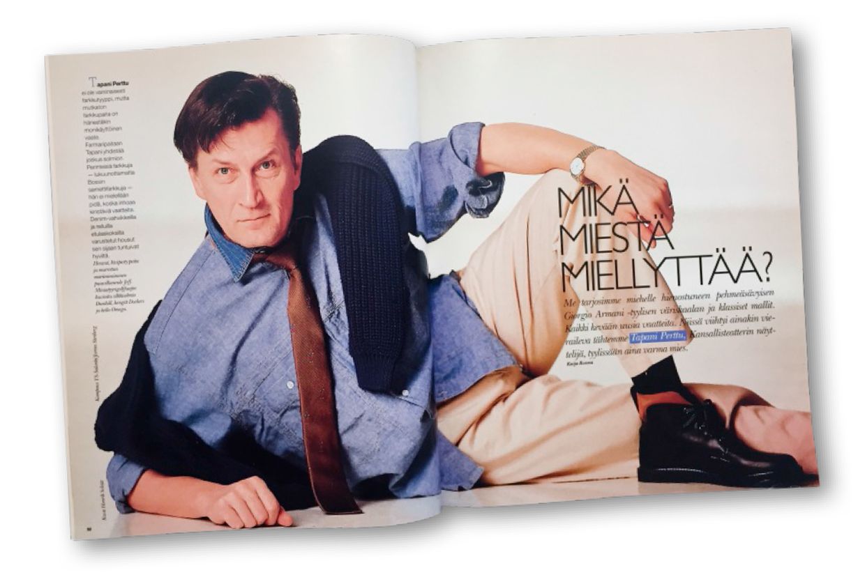 Miesten muotia hienostuneen pehmeissä sävyissä esiteltiin Gloriassa helmikuussa 1989, ja mallina poseerasi komea näyttelijä Tapani Perttu. Tapani kertoi jutussa olevansa pukumiehiä ja katselevansa Miami Vice -sarjaa miesten elegantin ja rennon tyylin tähden. Hänen omasta vaatekaapistaan löytyi sekä kotimaisia että ulkomaisia vaatteita, mutta kansainvälistä muotia hän piti suomalaista elegantimpana.
