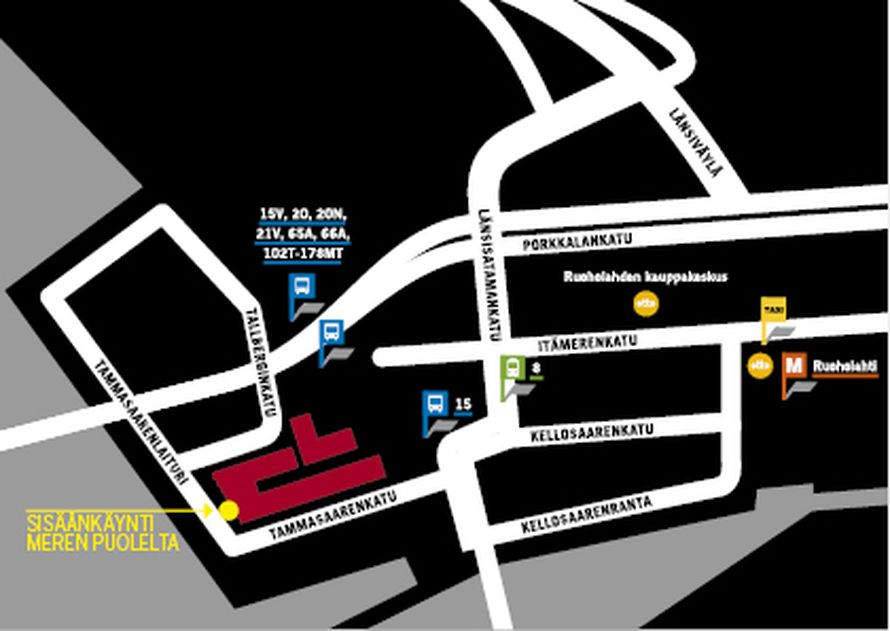 Jos tulet julkisilla tai kävellen, älä suunnista sisäpihalle vaan Kaapelitehtaan meren puoleiselle sisäänkäynnille M1 (Tammasaarenlaituri).