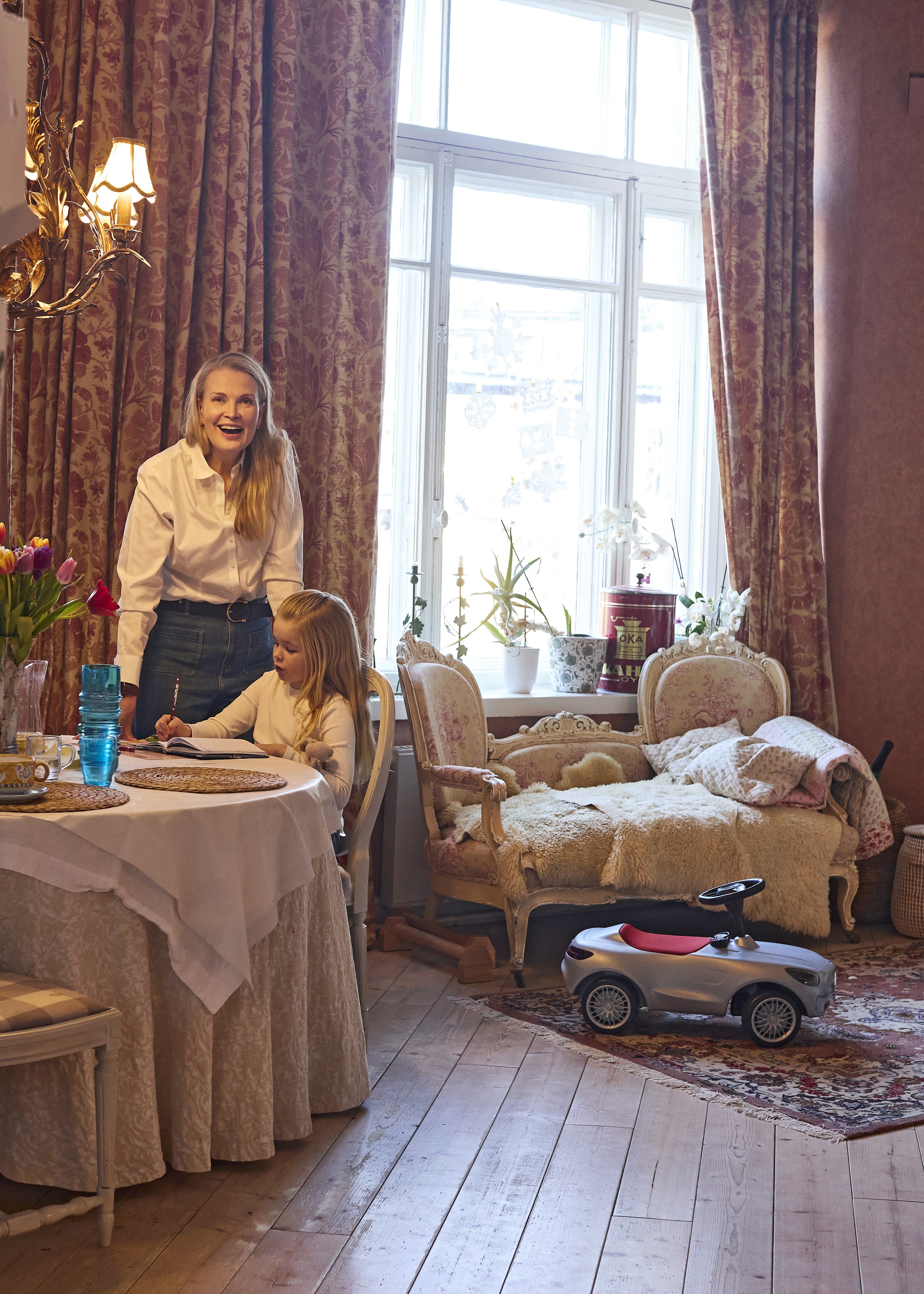 -Remonttimiehet sanoivat, että täältä puuttuu vain kamariorkesteri. Pidän sekä minimalistisesta että slaavilaisen koristeellisesta tyylistä, ja kotona näkyy tämä jälkimmäinen, Kirsi sanoo nauraen.