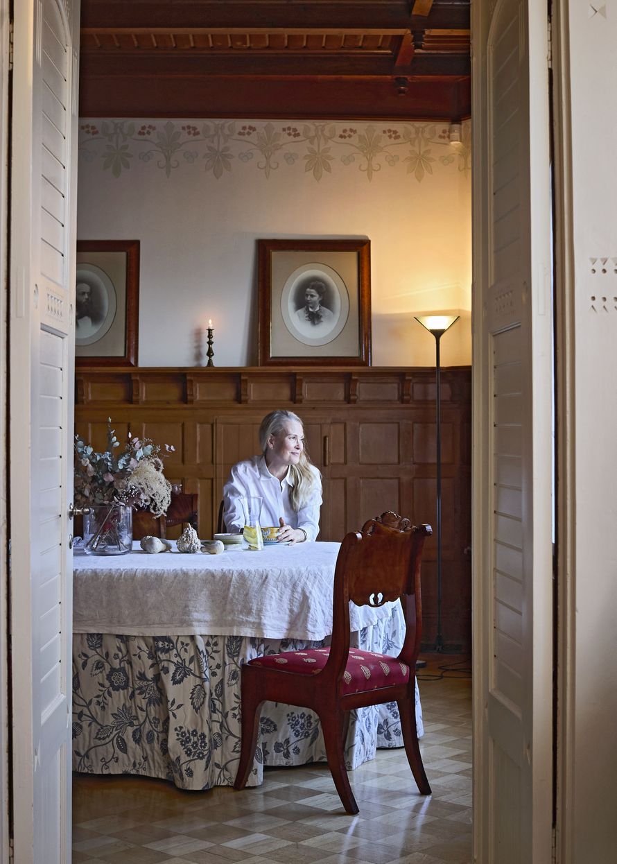 Pelkkä kynnyksen ylitys riittää, ja tuntuu kuin astuisi menneeseen aikaan. Kirsi Kaukosen ja hänen puolisonsa kodin ruokasali Helsingin kantakaupungissa on vaikuttava näky. Katto on alkuperäiskunnossa, ja mittavassa remontissa koko muu huone entisöitiin talon valmistumisvuoden 1898 tyyliin. Seinille palautettiin puiset paneelit.
