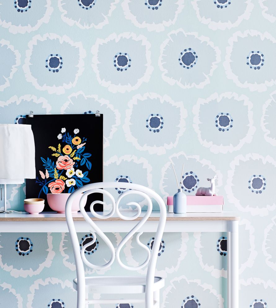 Tee työhuoneestasi vaikuttava ja naisellinen: tapetoi työpöydän taustaseinä jättimäisillä kukilla. Sandersonin Papavera Mineral Dove-tapetti 62e/rulla, Lauritzon. Ton 04 -tuoli 249 e, Forme. Juliste 45 e, Papershop.