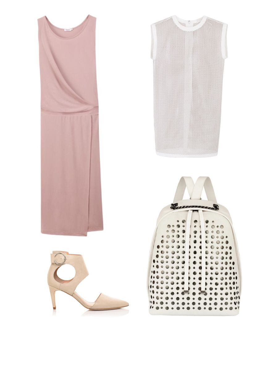 Trikoomekko 165 e, Filippa K. Verkkokankainen minimekko 89 e, Cos. Sigerson Morrisonin nilkkaremmikengät 349 e, MI.NO Shop. Nahkareppu 525 e, Furla.
