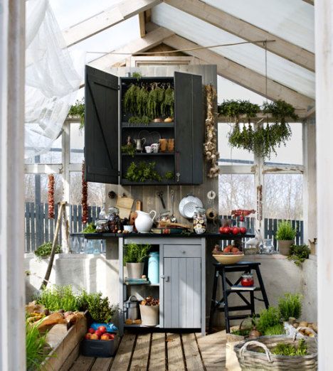 Olen pitkään haaveillut kasvihuoneesta, jossa kasvattaisin yrttejä ja kukkia. Siellä pitäisi olla istutuspöytä - ja oma rauha. Nyt löysin idean unelmieni kasvihuoneeseen, joka toimisi myös kesäkeittiönä!