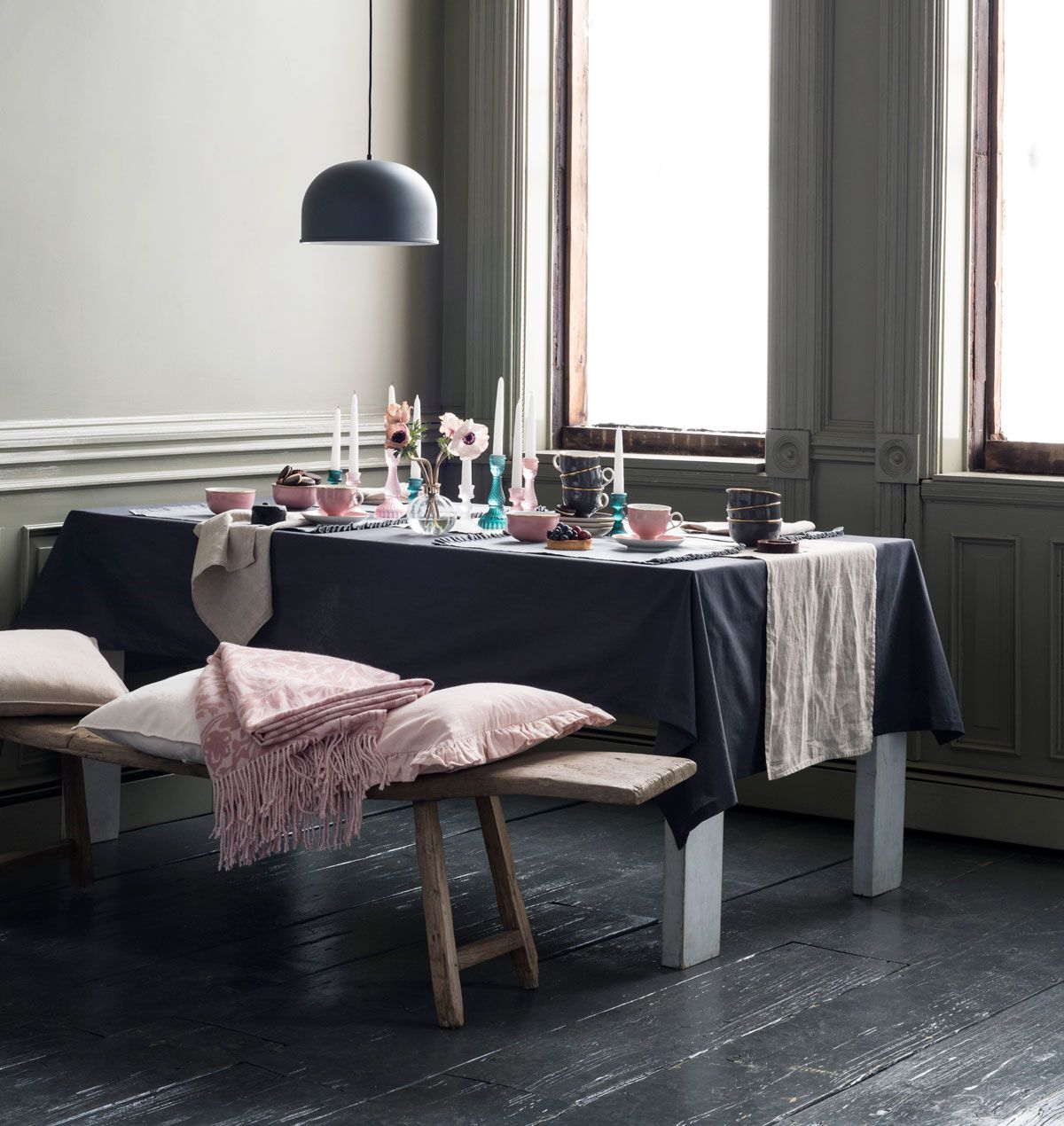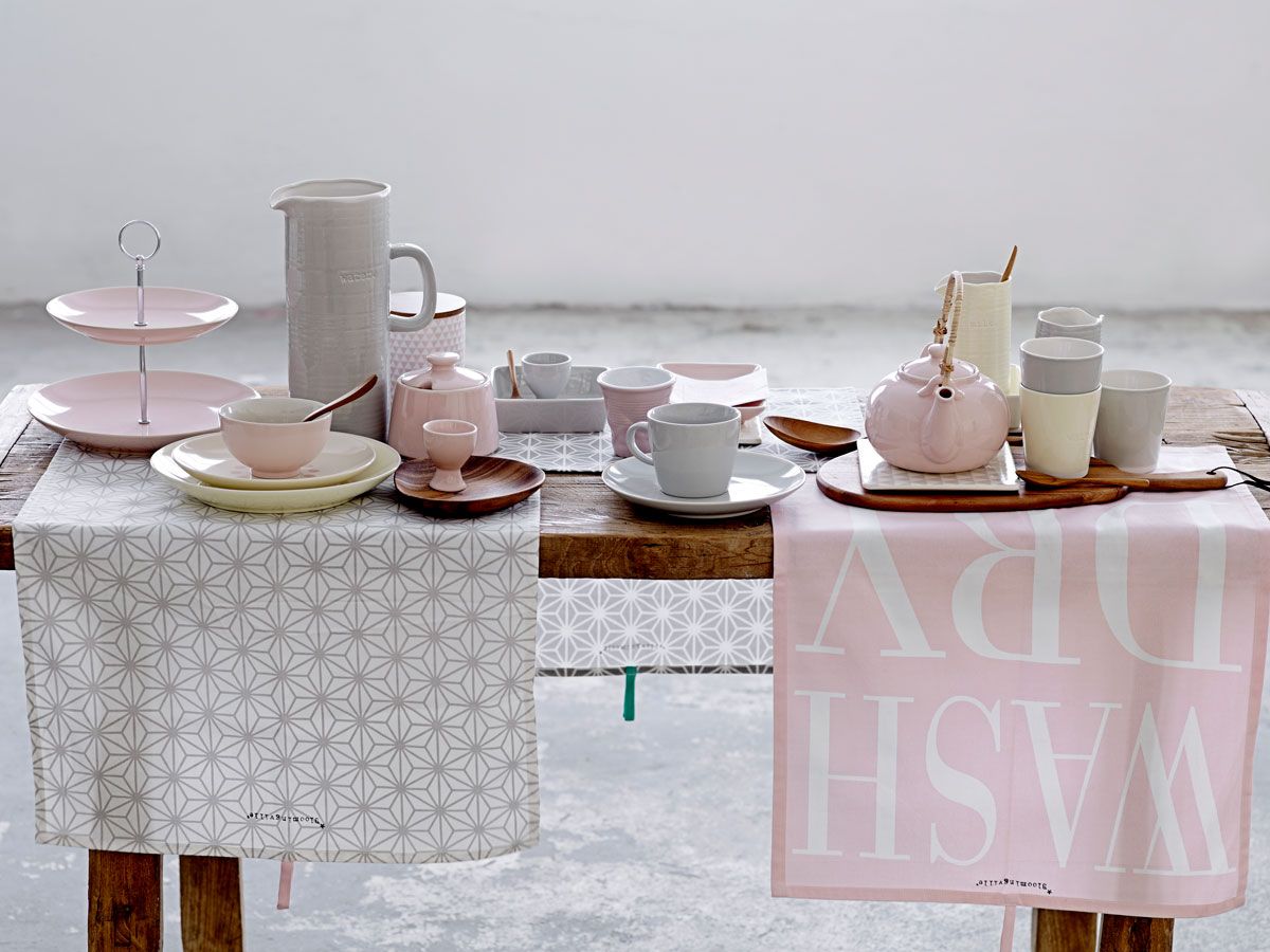 Tässä kattauksessa herkkä vaaleanpunainen on yhdistetty graafiseen tummaan harmaaseen ja yhdistävään beigeen. Mukana on muutama turkoosi väripilkku tuomassa kontrastia. Kuva: H&M Home.