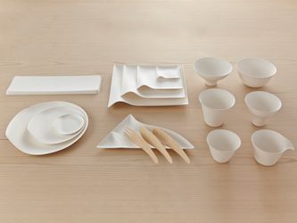 Yksinkertaisen tyylikkäät, kierrätysmateriaalista valmistetut japanilaiset Wasara-astiat voi kompostoida biojätteen mukana. Pino myy sarjasta isoa ja pientä lautasta, dippiastiaa, viinimukia ja kahvikuppia.