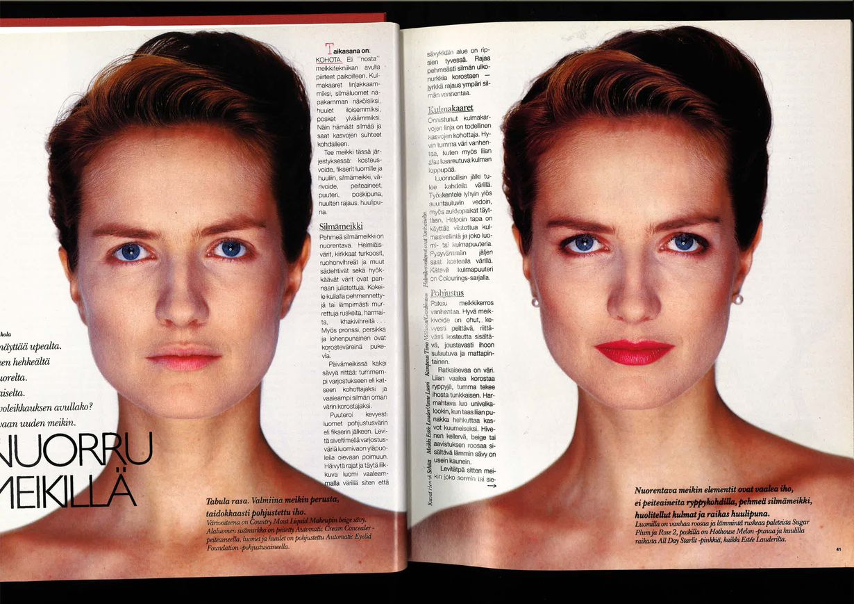 Vuonna 1990 ei vielä tunnettu voimakkaita contour-varjostuksia tai tavoiteltu Cara Delevingnen tummia kulmakarvoja, vaan meikissä keskityttiin hehkeään ja ennen kaikkea nuorentavaan lopputulokseen. Tammikuun 1990 Gloria lupasi, että näitä ohjeita noudattamalla voit näyttää "upealta, erilaiselta, ihmeen hehkeältä ja nuorelta". Taikasana oli kohottaminen ja kasvojen piirteiden nostaminen meikin avulla.