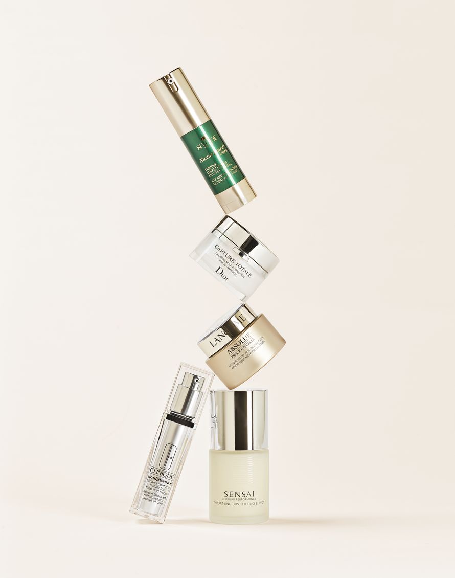 Kaulan ja dekolteen iho vanhenee kasvojakin herkemmin, sillä se on ohuempaa. Siksi tuolle alueelle on hyvä hankkia oma hoitotuotteensa. Sensain emulsio vaikuttaa jo viidessä päivässä, lisäksi tuote liftaa välittömästi. Pakkauksessa ohjeet hierontaan. Sensai Cellular Performance Throat and Bust Lifting Effect 106,60 e/100 ml.