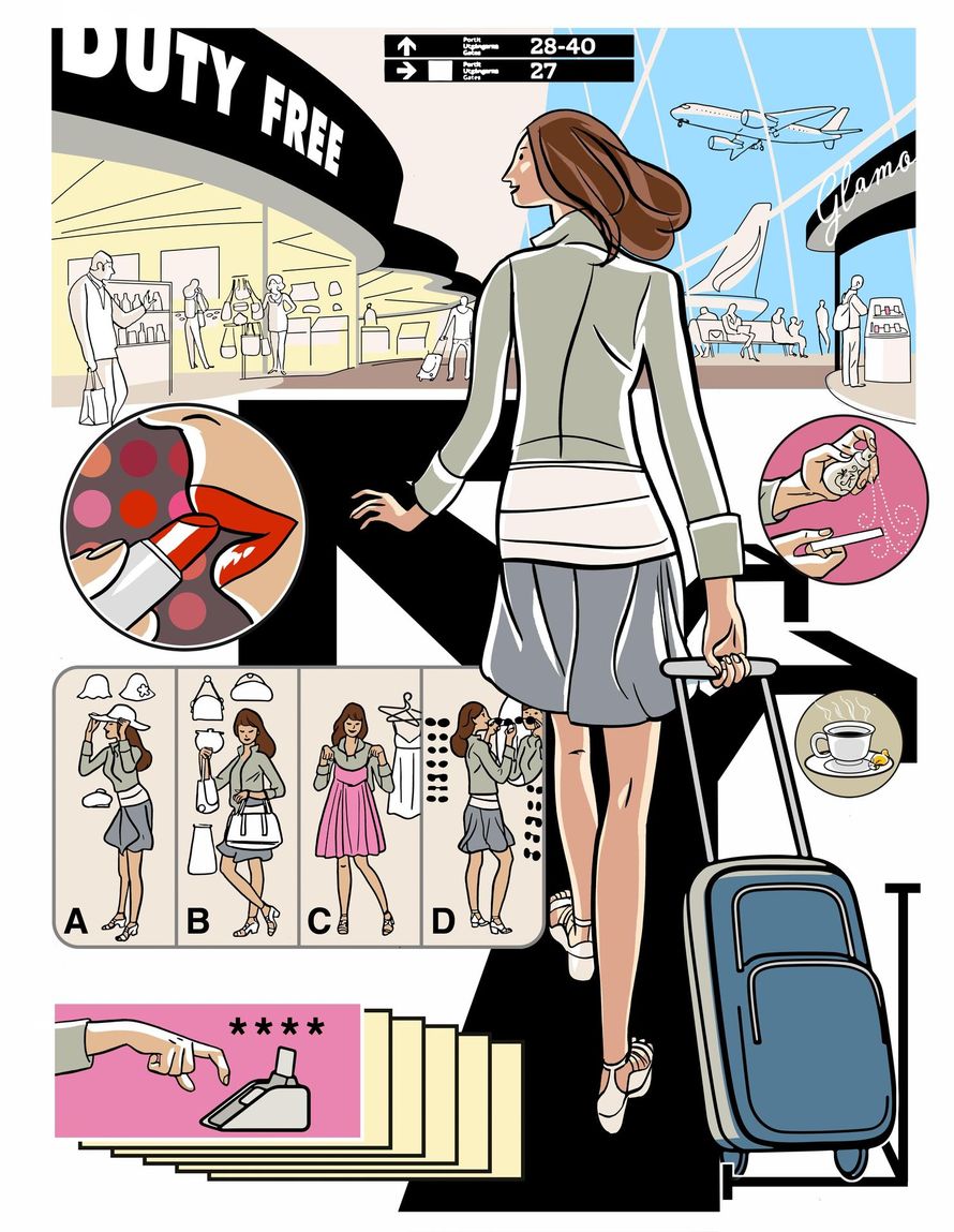 Se täydellinen odotuksen hetki ennen lentomatkaa. Vaeltelet kentän kiiltävissä tax free -putiikeissa, suihkautat ranteeseen ylellistä uutuustuoksua ja vertailet Pradan ja Guccin aurinkolaseja. Vielä ennen koneen lähtöä on aikaa piccoloskumpalle.