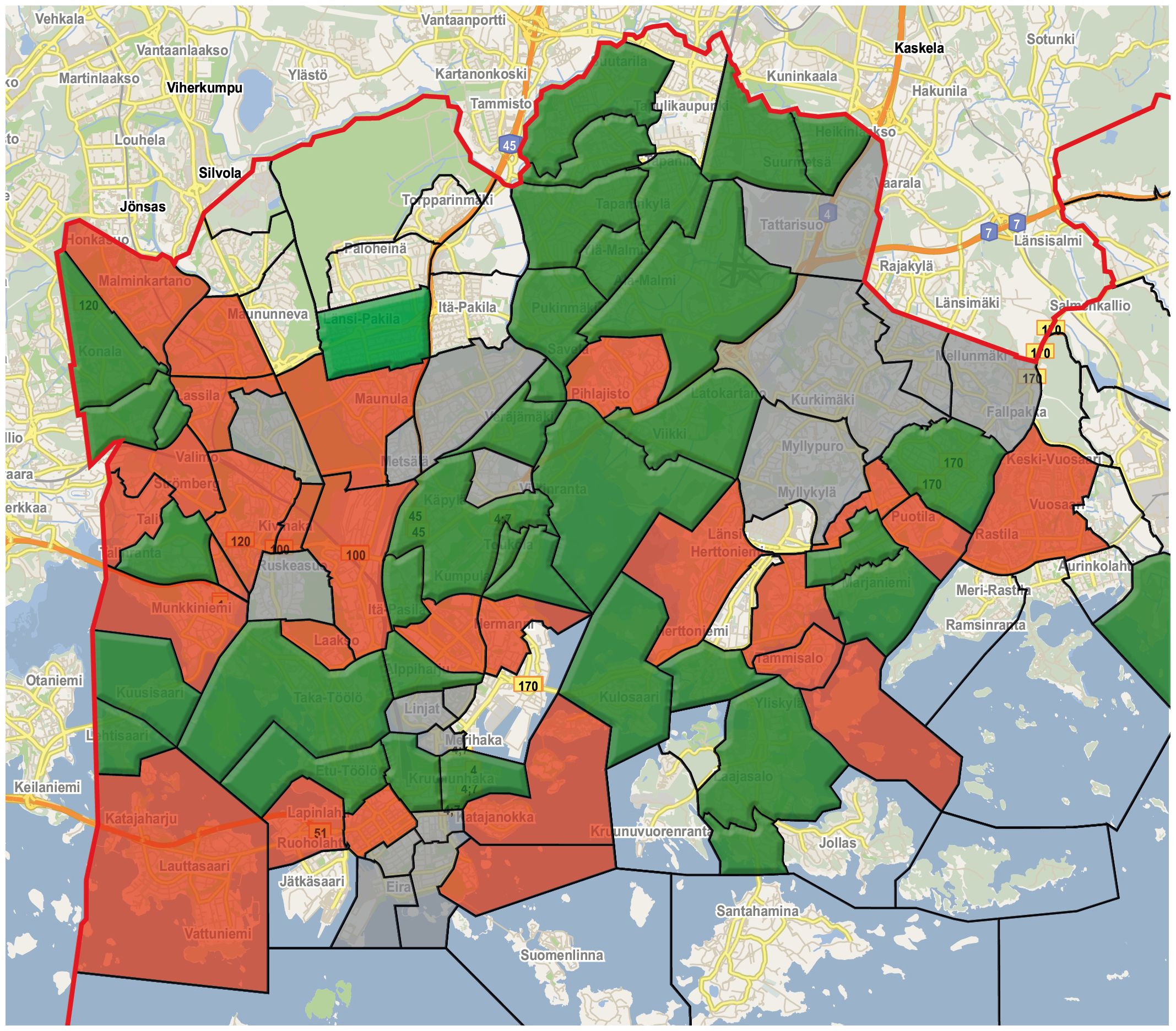 Kartan vihreillä alueilla huonekorkeus nostaa asunnon hintaa. Punaisilla se laskee ja muilla alueilla sillä ei ole vaikutusta.