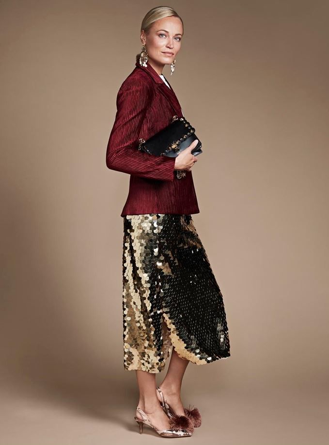 Midimittainen paljettihame 140 e, French Connection. Gas Bijoux -korvakorut 260 e, La Matta. Fendin laukku 1 750 e, Luxbag. Tupsukoristeiset sling back -kengät  179 e, Ted Baker.