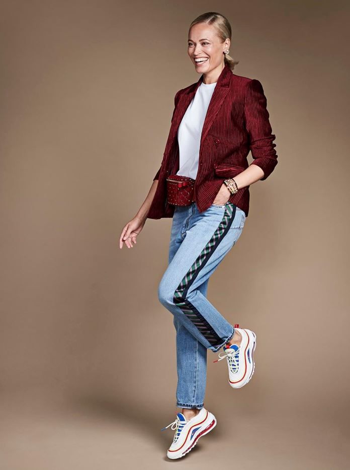 Acne Studiosin t-paita 120 e, Beamhill. Sivutereillä terästetyt  boyfriendfarkut 249 e, Sportmax Code/MaxMara Helsinki. Valentinon vyölaukku 1 240 e, Della Marga. Gas Bijouxin korvakorut 65 e ja rannekorut88 e–150 e, La Matta. Niken lenkkarit 200 e, Beamhill.