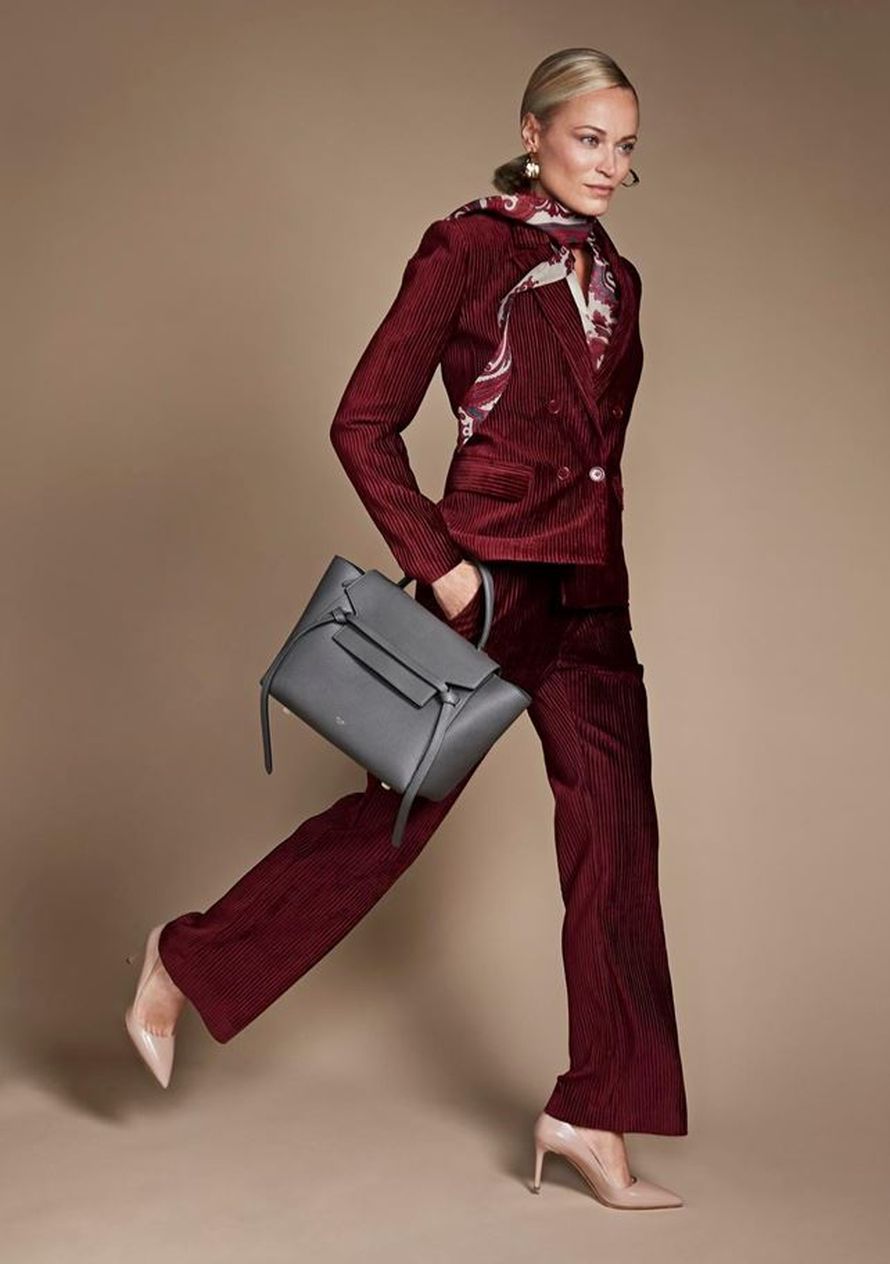 Vakosamettihousut 109,95 e, In Wear. Huivikauluspusero 190 e, Whyred. Korvakorut 95 e, Dyrberg/Kern. Célinen laukku 1 750 e, Luxbag. Klassikkoavokkaat 565 e, Prada.