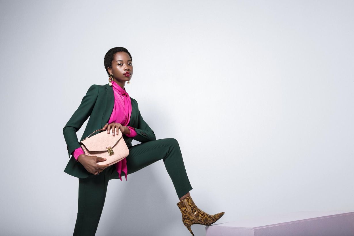 Vihreän ja pinkin yhdistelmä on täysosuma. Hugo Bossin bleiseri 349 e ja housut 179 e, Stockmann. Silkkipusero 89,99 e, H&M. Laura Joanna Constantine -korvakorut 235 e, Mycoko. Timanttisormukset 2 480 e -4 400 e, Rubens. Laukku 1 650 e, Louis Vuitton. Nilkkurit 39,99 e, H&M. Meikki Miika Kemppainen/Lumene.