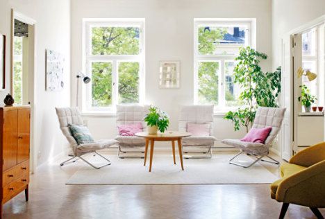 Moderni K-tuoli kaipaa seuraansa jotakin vanhaa. Sohvapöytä, lipasto ja pikkusohva ovat vintagea ja hankittu antiikkiliikkeestä. Huomaa, että tässä olohuoneessa ei ole isoa löhösohvaa lainkaan, vaan se on korvattu neljällä nojatuolilla. Lisäksi tuoleilla on tyynyt tuomassa pehmeyttä ja väriä.