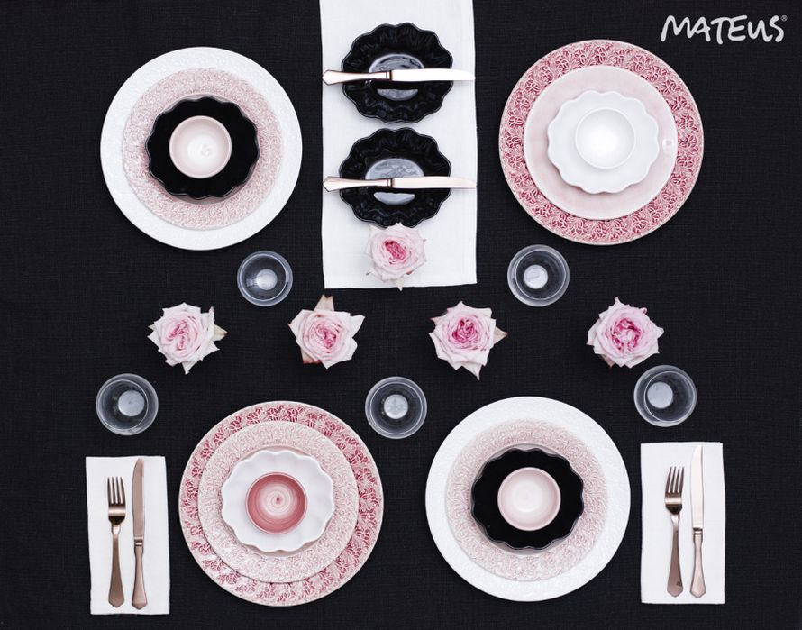 Mateuksen kauniilla astioilla on tehty näyttävä kattaus ystävänpäiväksi: musta sopii täydellisesti herkän vaaleanpunaisen pariksi. Kuva: <a href="http://www.mateus.se/" target="_blank">Mateus</a>.