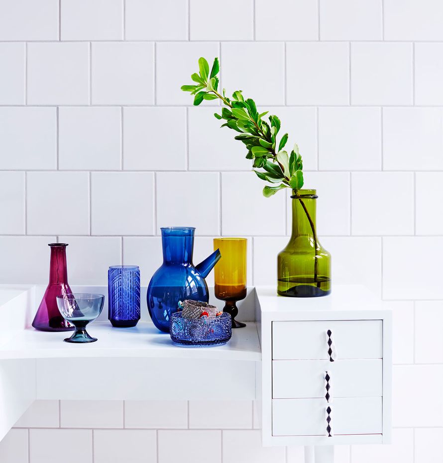 Kuvassa: Tapio Wirkkalan liila karahvi (Iittalan tuotannossa 1959–66) 350 e ja vihreä lasipullo 125 e sekä Oiva Toikan keltainen maljakko 3407 (Iittalan tuotannossa 1958–66) 48 e, Kruuna. Saara Hopean sininen, jalallinen Bistro-malja (Nuutajärven tuotannossa 1953–67) 22 e ja Timo Sarpanevan sininen nokkakarahvi (Iittalan tuotannossa 1950-luvun lopulla) 104 e, Momono. Nanny Stillin sininen 1970-luvun jälkiruokakulho 30 e ja 1960-luvun Flindari-juomalasi, 18 e, olivat Riihimäen lasin tuotantoa, Astiataivas.
