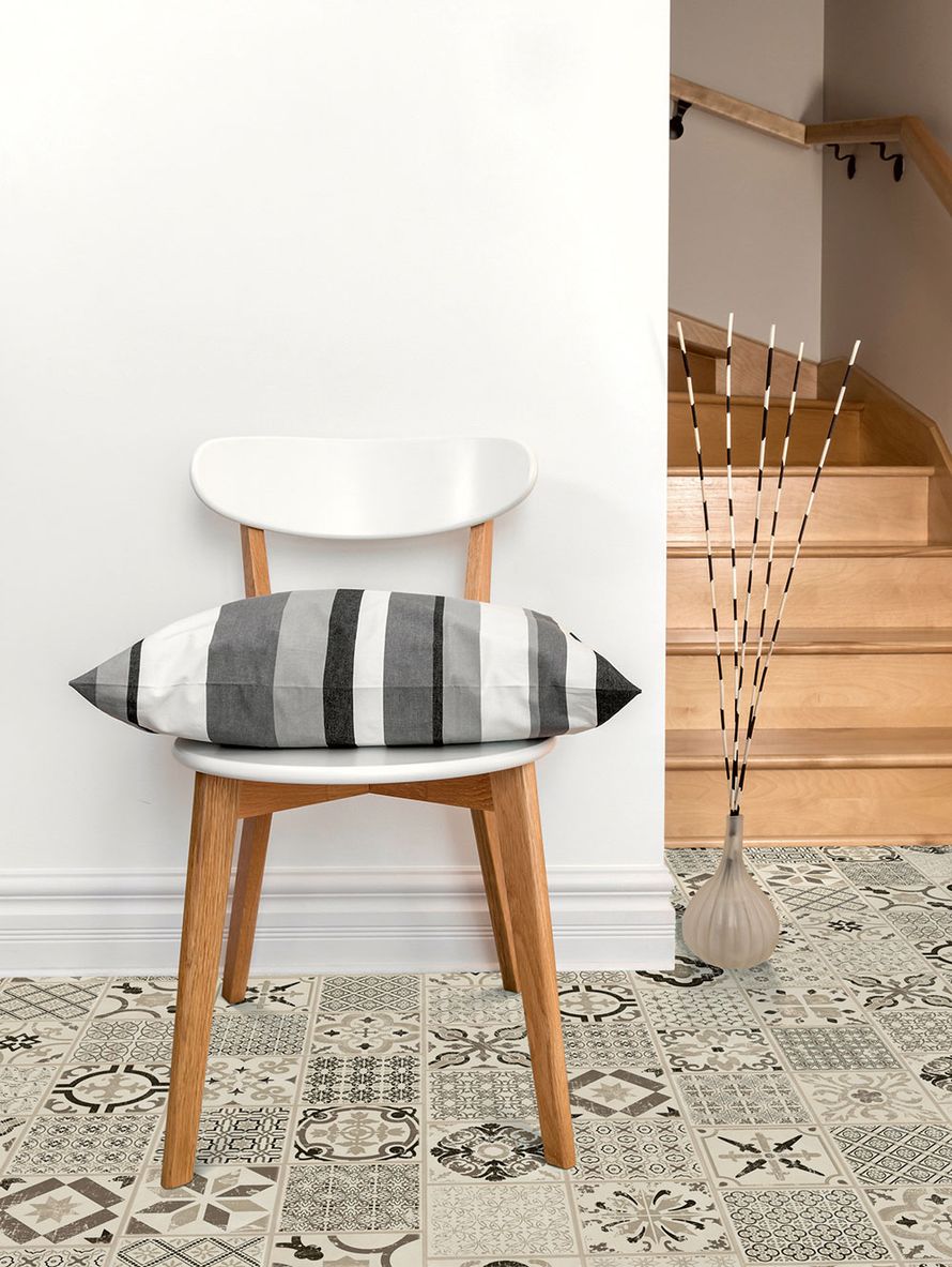 Eteisen kulahtanut lattia antaa heti alkuun vieraille nuhjuisen vaikutelman. Lattian saa nopeasti siistiksi uudella Starfloor Click -lattialla. Se on lukkopontillinen vinyylilattia, joka on helppo asentaa. Retrokuosi Retro Black White on marokkolaisten kaakelien inspiroima, noin 35 €/m2, Tarkett.
