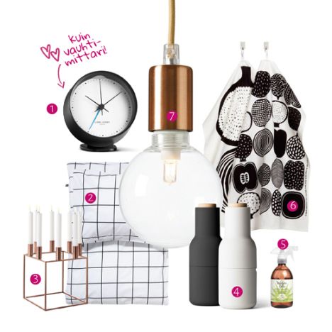 Raha. Siinäpä se valmistuvan nuorukaisen lahjatoivelistan ykkönen. Mutta etenkin vanhempien suojista muuttava ei välttämättä arvaakaan, kuinka pitkän ostoslistan oman elämän aloittaminen vaatii. Käytännöllisetkin sisustuslahjat ovat tällöin enemmän kuin paikallaan – niiden tuojaa kiitetään mielessä vielä pitkään juhlien jälkeenkin. Astiasto, kattila ja ehkä jopa se aterinsetti monelta löytyykin jo etukäteen, mutta keittiön perustarvikkeiden puuttumisen huomaa viimeistään ensimmäistä voileipää valmistaessa. Yhdistele samansävyisistä mutta erilaisista keittiötarvikkeista kiva ryhmä: leikkuulauta, hyvä kokinveitsi ja keittiöpyyhe ovat jo loistava alku. Kuva: Ferm Living Monikohan ensimmäiseen omaan kämppään muuttava on muistanut etukäteen miettiä eteistarvikkeita? Jos tuntee lahjansaajan maun hyvin, voi panostaa rohkeampaankin sisustuselementtiin. Tämä näyttävä saksinaulakko istuu loistavasti nuoren asukkaan kotiin - parturikampaajaksi valmistuneesta puhumattakaan. Kuva: One Must Dash. Hillityn värinen grafiikkajuliste on perin tyylikäs lahjavaihtoehto. Vältä mietelauseita ja erikoisia fontteja, sillä ne eivät istu ihan jokaiseen makuun. Esimerkiksi Ylva Skarpin valikoimista löytyy sanomaltaan neutraaleja mutta ulkomuodoltaan pysäyttäviä komistuksia. Kuva: Ylva Skarp. 1. Georg Jensenin herätyskello on kuin vauhtimittari, 109 e, Stockmann. 2. Annon Lomaruutu-pussilakanasetti, 29,90 e, Kodin1. 3. Kubus-kynttilänjalkaa saa monessa koossa ja myös mustana tai valkoisena, alk. 59 e, by Lassen. 4. Suola- ja pippurisiroittimet, n. 55 e, Menu. 5. Kerää sopiva setti kauniita siivoustuotteita ja pakkaa ne vaikkapa kivaan kangaskoriin. Maison Bellen yleispuhdistussuihke, 7,50e, Stockmann. 6. Kompotti-keittiöpyyhesetti, 29,50 e, Marimekko. 7. Simppeli Sladd-lamppu sopii myös moneen makuun – ja moneen tilaan. Musta, kuparinen tai valkoinen, 29,95 e, Ellos.