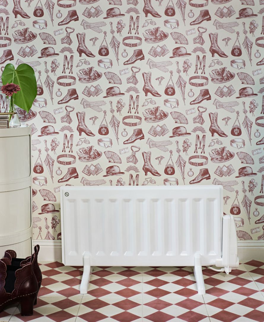 Ruudullisen lattian ja kuvioillisen tapetin värimaailmat ja kuosit kulkevat käsi kädessä. Kokeile rohkeasti perinteisen mustavalkoisen ruutulattian sijaista ruosteisia ruutuja. Kuvan Kaba-lämmitin alkaen 190 euroa, LVI. Kuva: Perpr